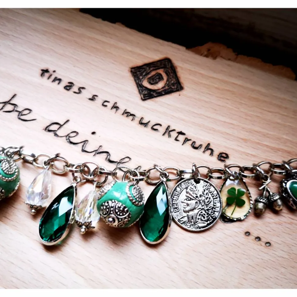 Dieses klassische Charivari in der Farbkmbination silber- grün wurde aus geschliffenen Glastropfen, handverzierten Kashmiri-Perlen, einfassten Glasanhängern, Herzen mit Schmucksteinen und Harzanhänger mit Kleeblatt an einer Metallkette gefertigt.