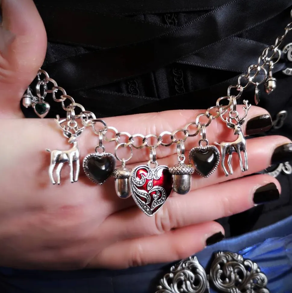 Das Charivari ist ca. 22 cm lang und kann auf vielfältige Weise am Dirndl befestigt werden.