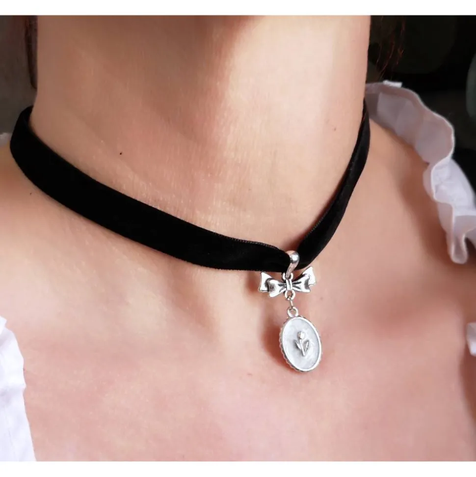 Die Kette besteht aus einem zarten Samtband mit einem Verlängerungskettchen und einer Gesamtlänge von ca. 45 cm.
