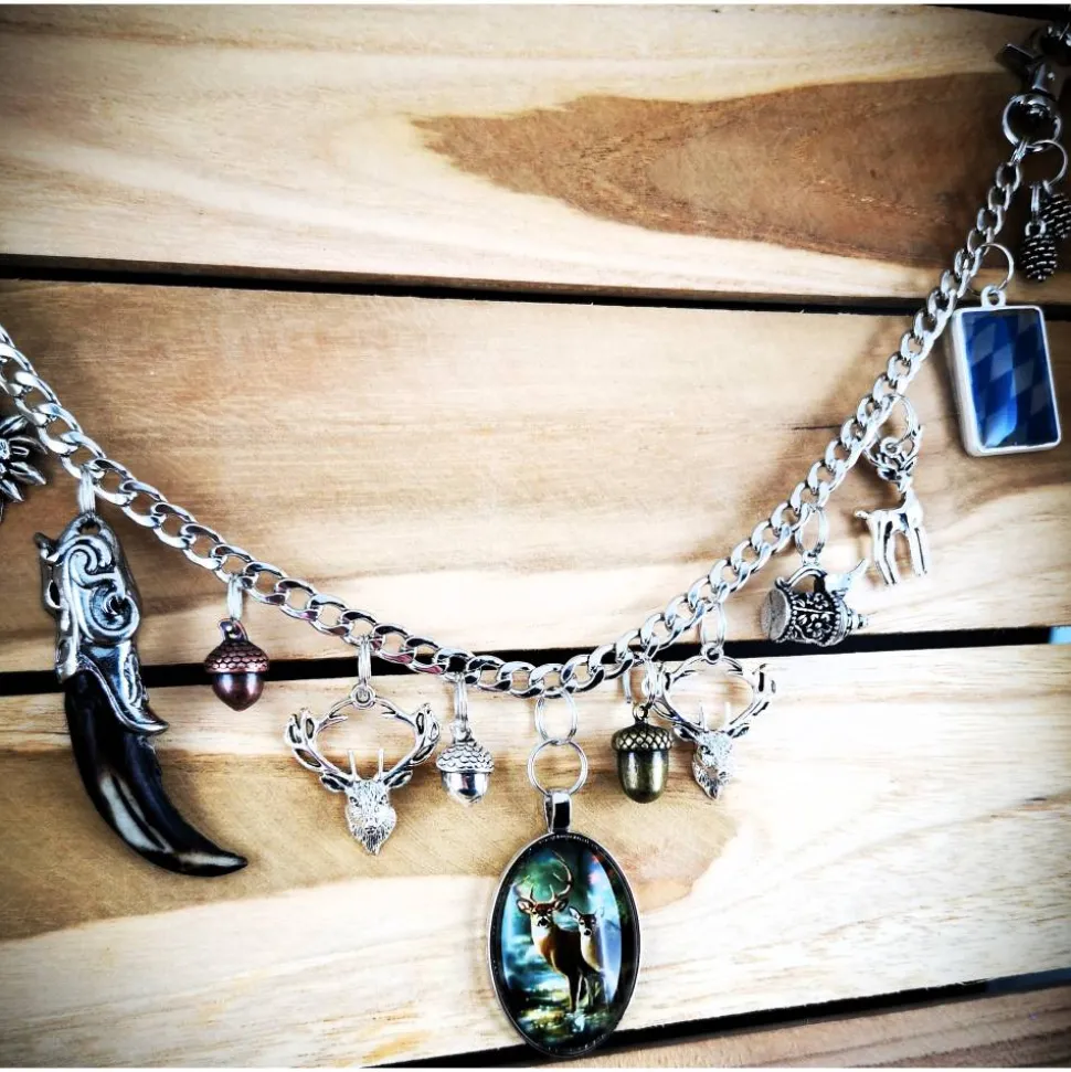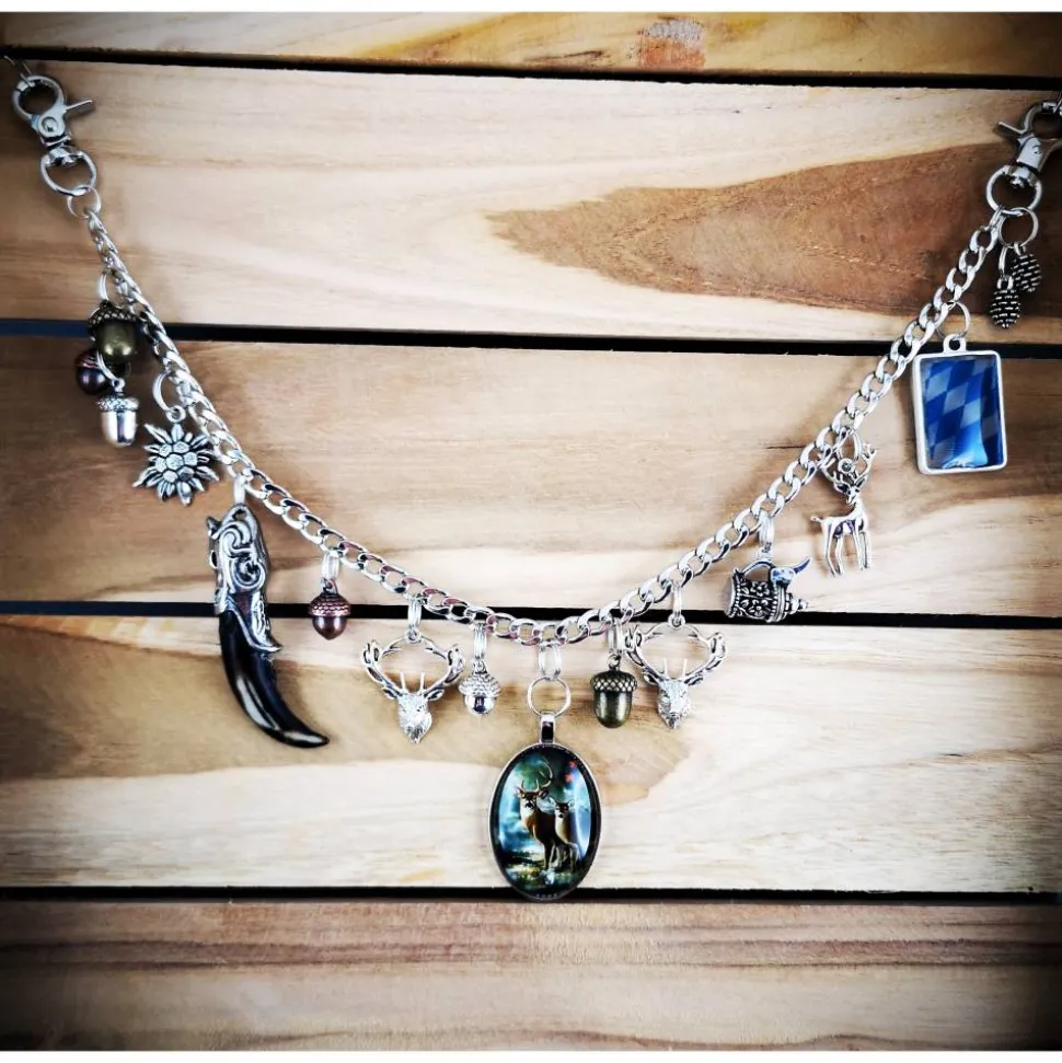 An der robusten Panzerkette aus Metall sind verschiedene Anhänger befestigt, darunter ein Glasanhänger mit Hirsch und Reh, kunstvoll gestalteter Stoßzahn, ein liebevoll gestalteter Bierhumpen mit beweglichem Deckel und das Bayernwappen aus Harz.