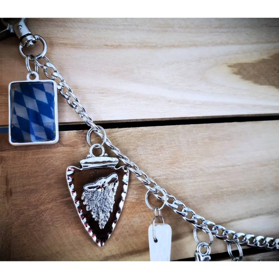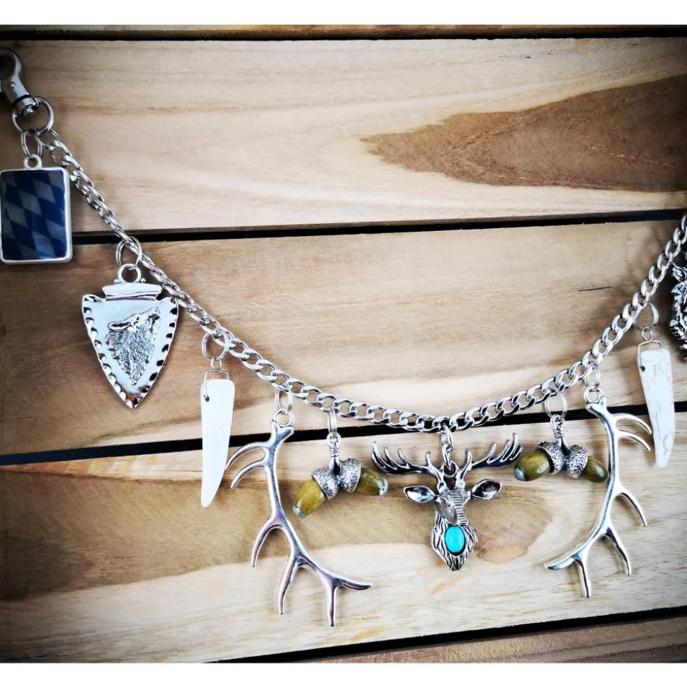 An der robusten Panzerkette aus Metall sind verschiedene Anhänger befestigt, darunter ein verzierter Hirschkopf, ein Bayernwappen aus Metall und Harz, Steinzähne, und Eicheln aus Holz und Harz.