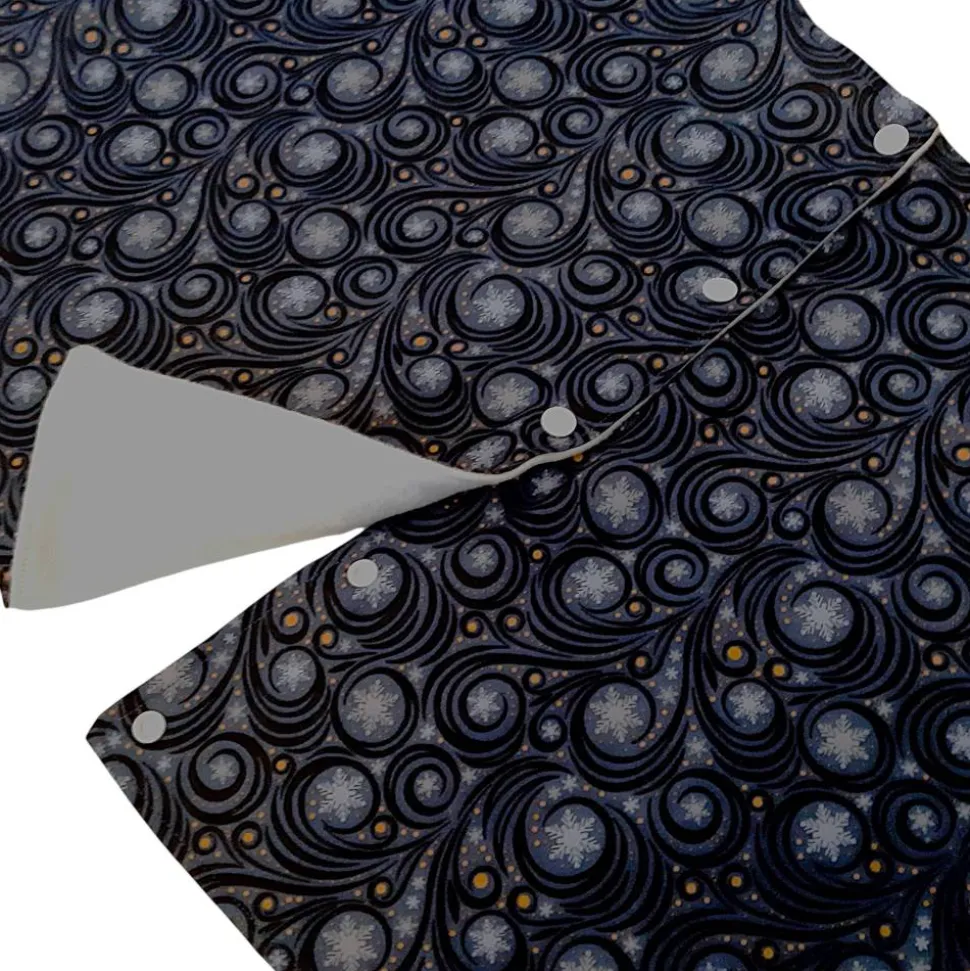 Die Christbaumdecke ist an einer Stelle durch Druckknöpfe zu öffnen, damit man sie leicht um den Baum legen kann. Die untere Seite der Baumdecke besteht aus Fleece, wodurch sie etwas schwerer und weicher ist. Somit fällt die Baumdecke schön und macht zu gleich eine kuschlig-warme Ambiente.