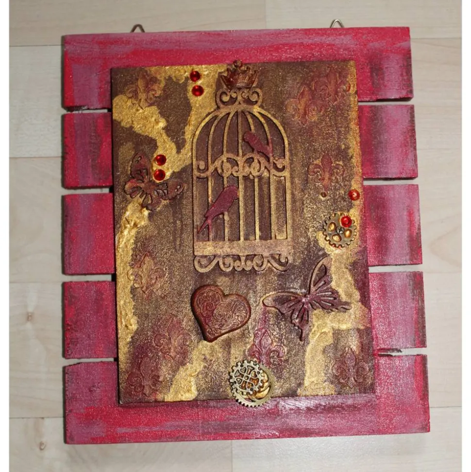 Auf Holz gestaltete Collage. Mit Applikationen aus Holz, Metall und Kunststoff, gestaltet mit Acrylfarben in Gold, Braun und Weinrot. Eine kleine Gestaltung der etwas anderen Art!