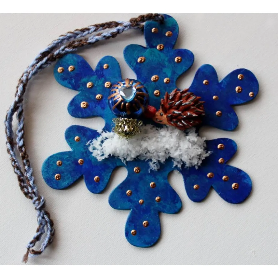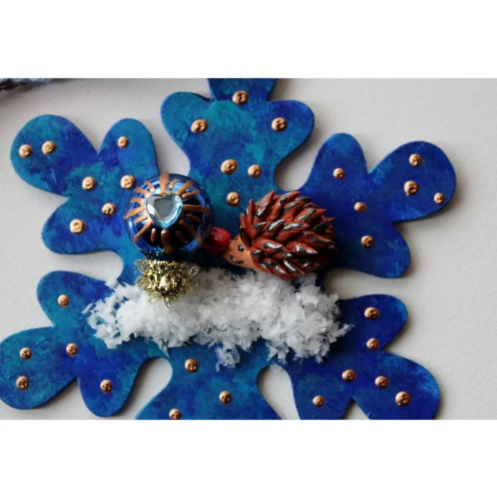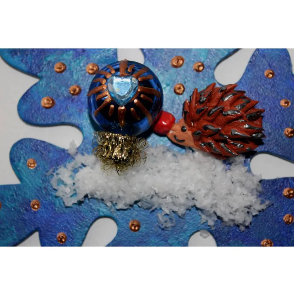Bemalt mit Acrylfarben, dekoriert mit einem handmodelierten Ton-Igelchen, Kunstschnee und einer kleinen Weihnachtskugel.
