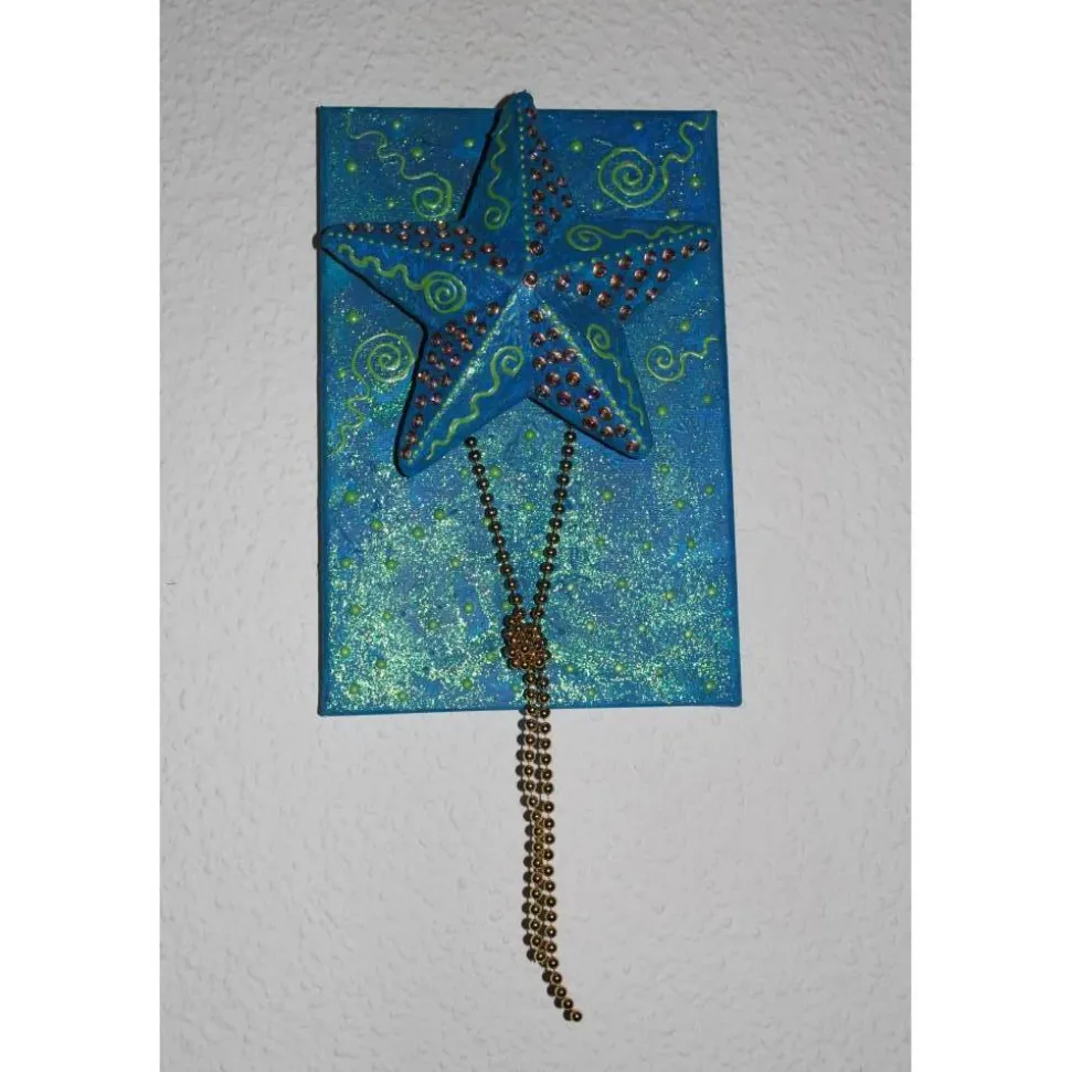 Der Stern ist auf einem Keilrahmen befestigt und mit unzähligen Glitzersteinen und Perlenkette dekoriert. Die Verzierungen sind mit Acrylfarben gestaltet.
