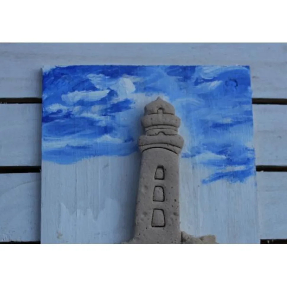 Auf Holz gestaltete Collage im Shabby-Stil. Aus Sand und Muscheln gestaltet, mit Acrylfarben bemalt.