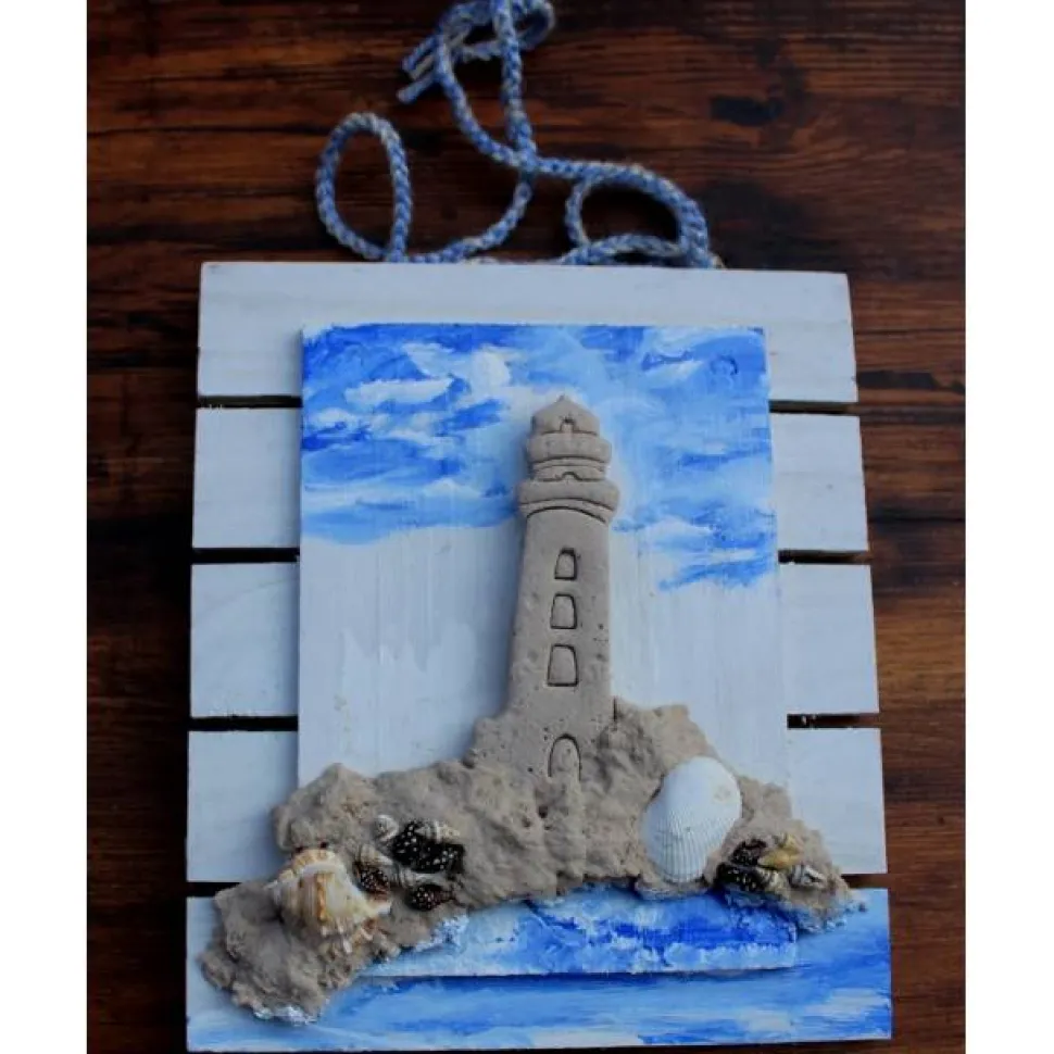 Auf Holz gestaltete Collage im Shabby-Stil. Aus Sand und Muscheln gestaltet, mit Acrylfarben bemalt.