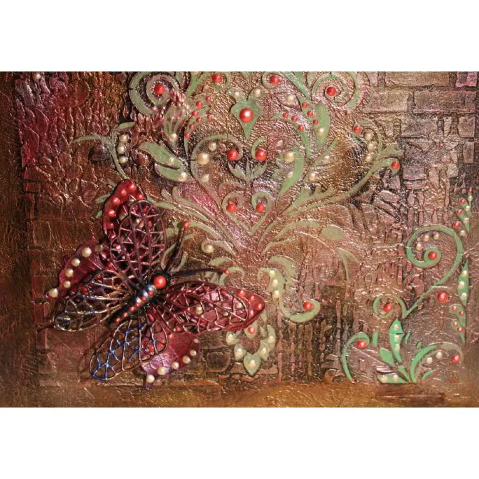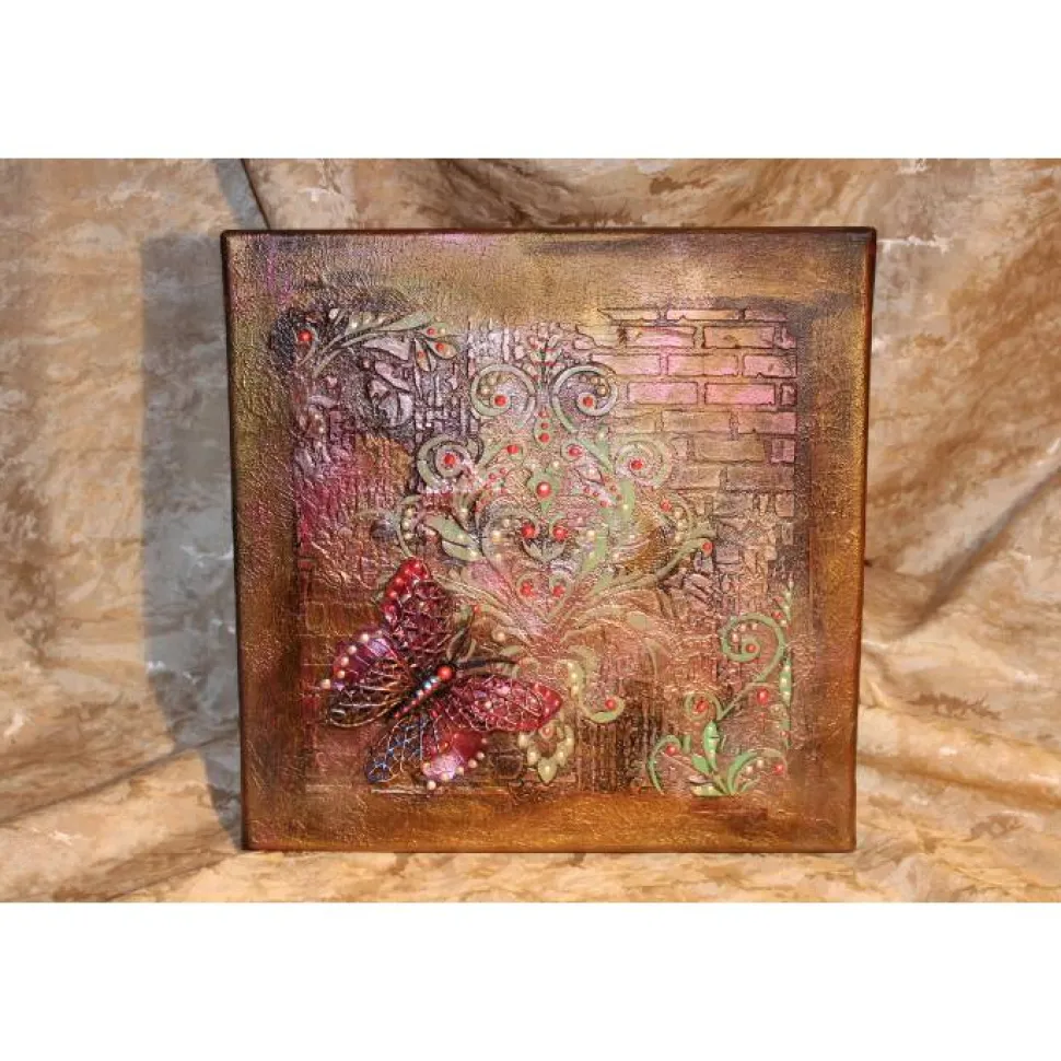 Der Hintergrund ist mit Schabloniertechnik gestaltet. Der platzierte Schmetterling ist aus Kunststoff, bemalt mit schillernden Acrylfarben.