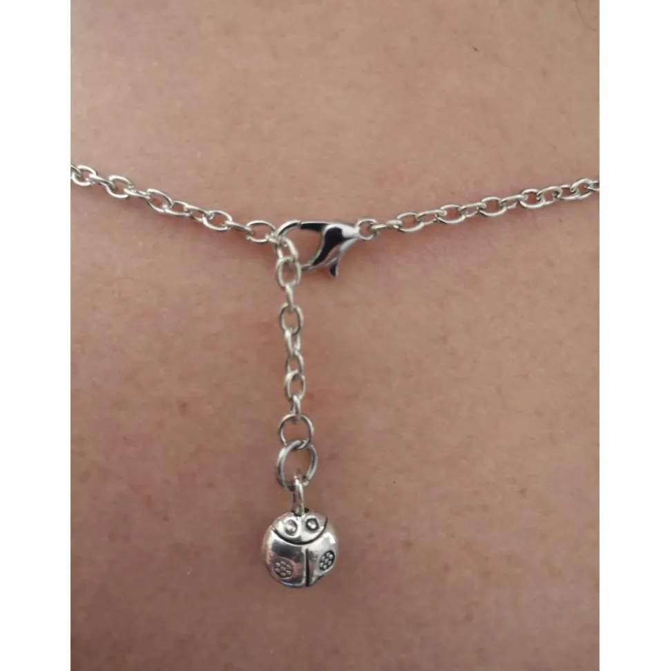 Zu schließen ist die Kette mit einem Karabinerhaken, wo ebenfalls ein kleiner Schmuckanhänger ist.