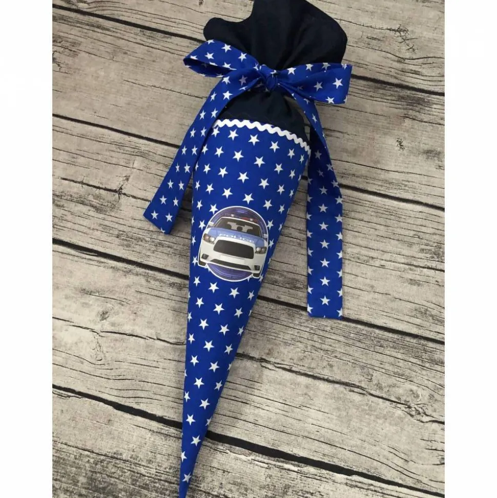 Sie ist in Blau mit Sternen, verziert mit einem coolen Polizei-Motiv.
