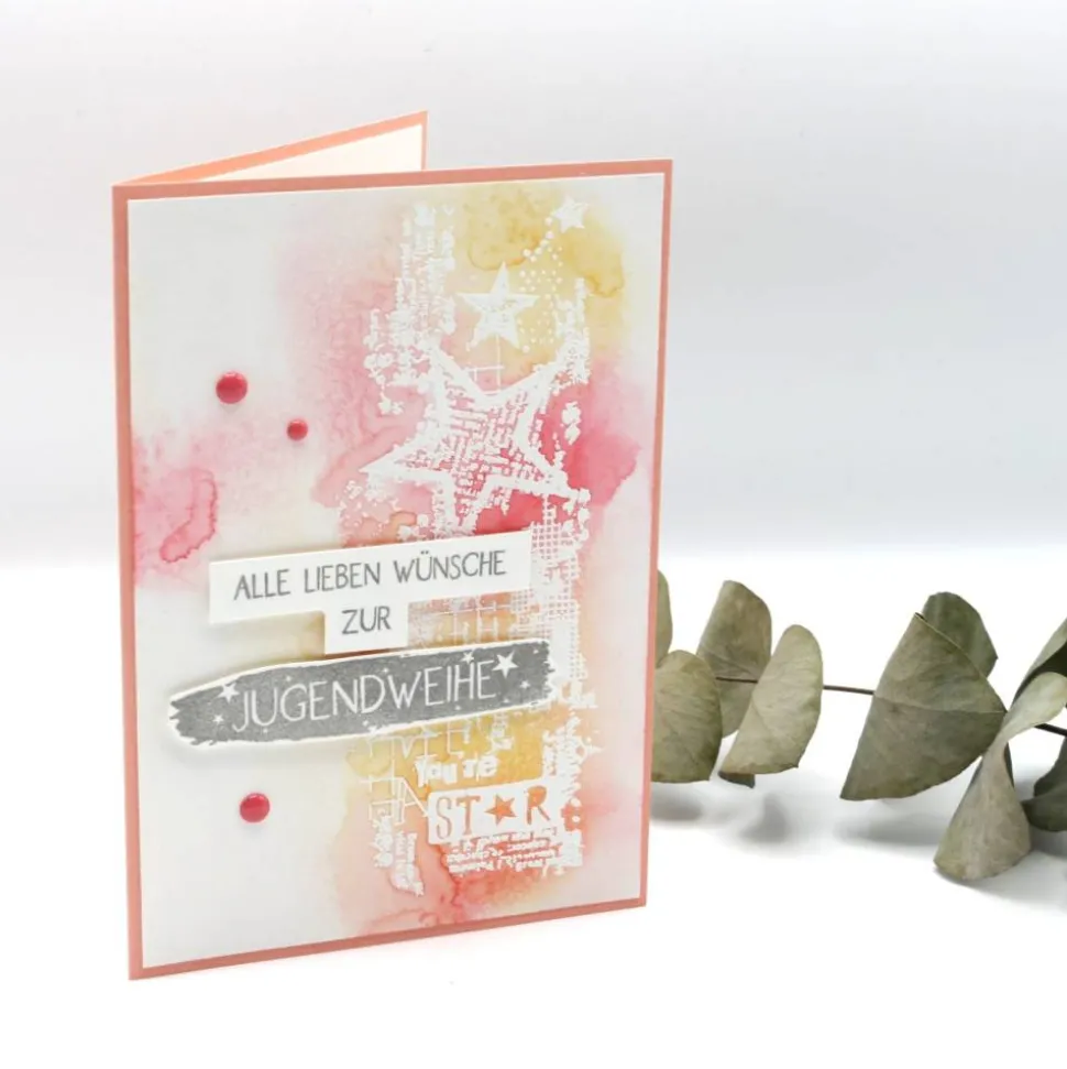 Sterne, die über die Karte verteilt sind, symbolisieren den Beginn eines neuen Lebensabschnitts und den Glanz der Jugendweihe.
