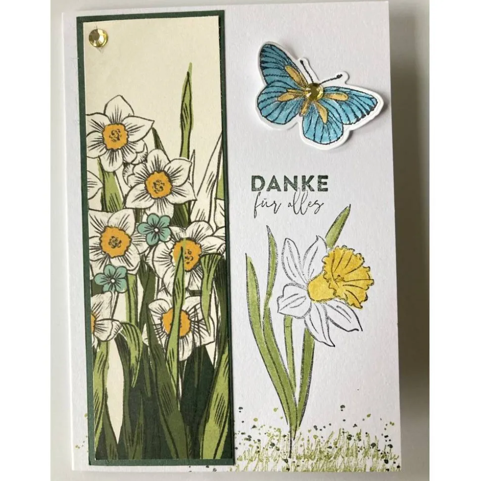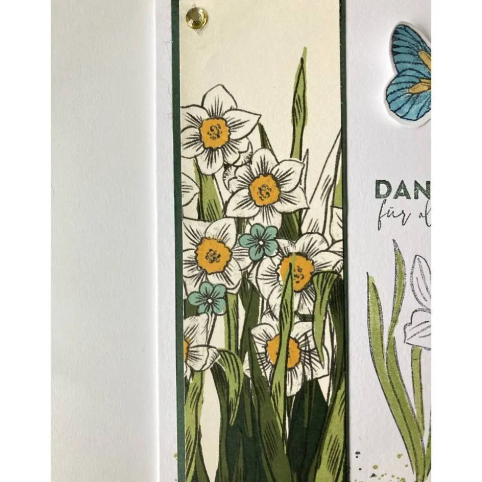 Diese Karte besteht aus einem Grundkarton in der Farbe „Grundweiß „. Aufleger Farbkarton Lodengrün & Designpapier Narzissenzeit.
