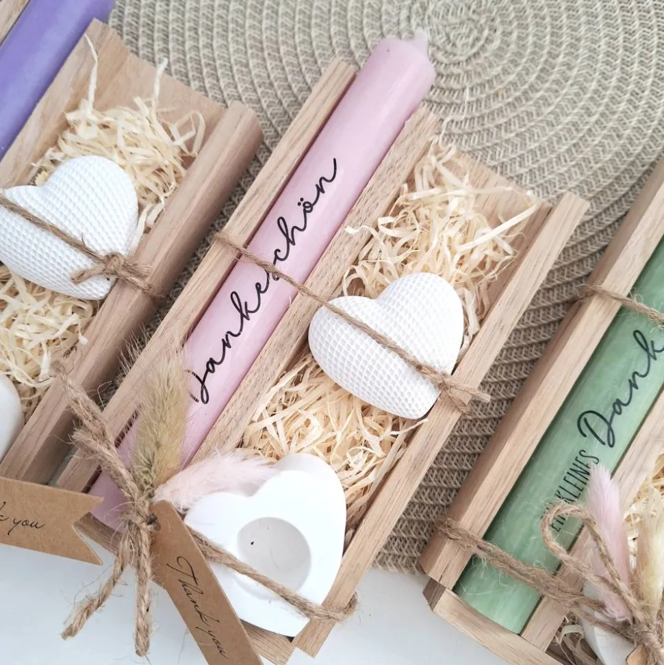 Das Kerzenset besteht aus einer Kerze (in der Farbe deiner Wahl) mit der Aufschrift deiner Wahl,einem Dekoherz und einem passendem Kerzenhalter in Herzform.