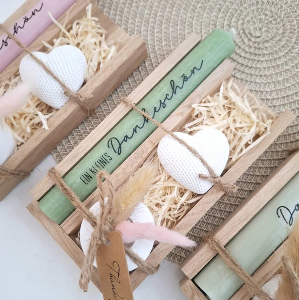 Das Geschenkset wird in einer Holzbox zusammengebunden, mit Trockenblumen (können variieren) verziert und mit einem Anhänger “ Thank you “ ergänzt.