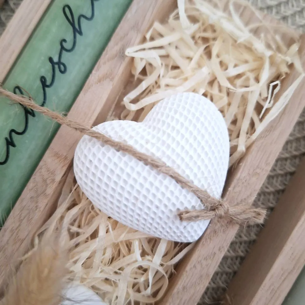 Das Kerzenset besteht aus einer Kerze (in der Farbe deiner Wahl) mit einer Aufschrift deiner Wahl, einem Dekoherz und einem passendem runden Kerzenhalter.