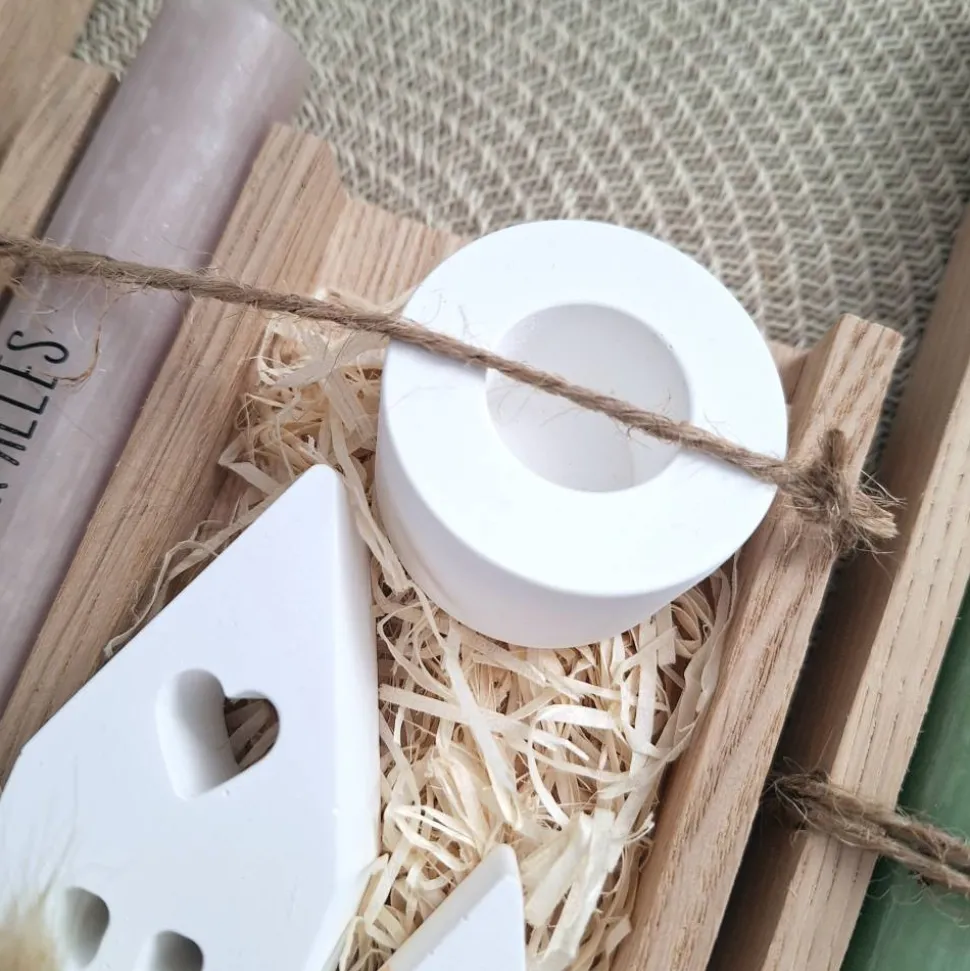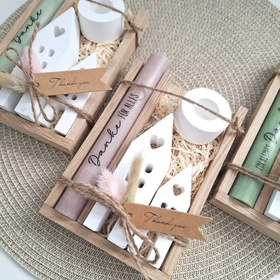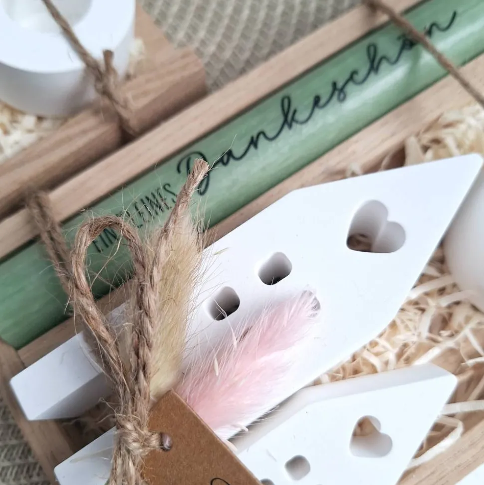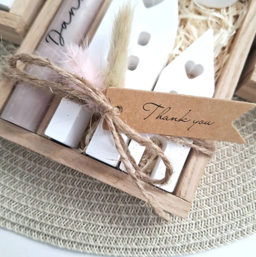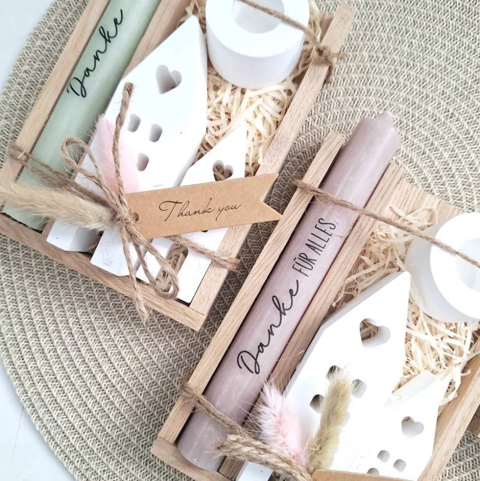 Das Geschenkset wird in einer Holzbox zusammengebunden, mit Trockenblumen (können variieren) verziert und mit einem Anhänger “ Thank you “ ergänzt.