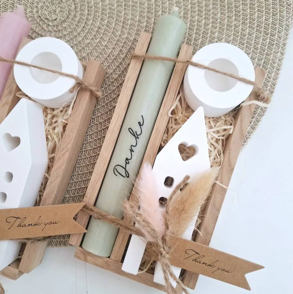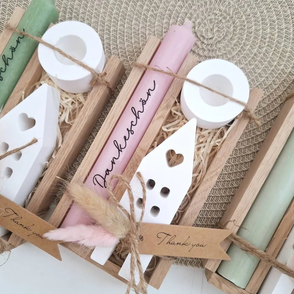 Das Kerzenset besteht aus einer Kerze (in der Farbe deiner Wahl) mit einer Aufschrift deiner Wahl, einem passenden runden Kerzenhalter und einem Haus / Lichthaus