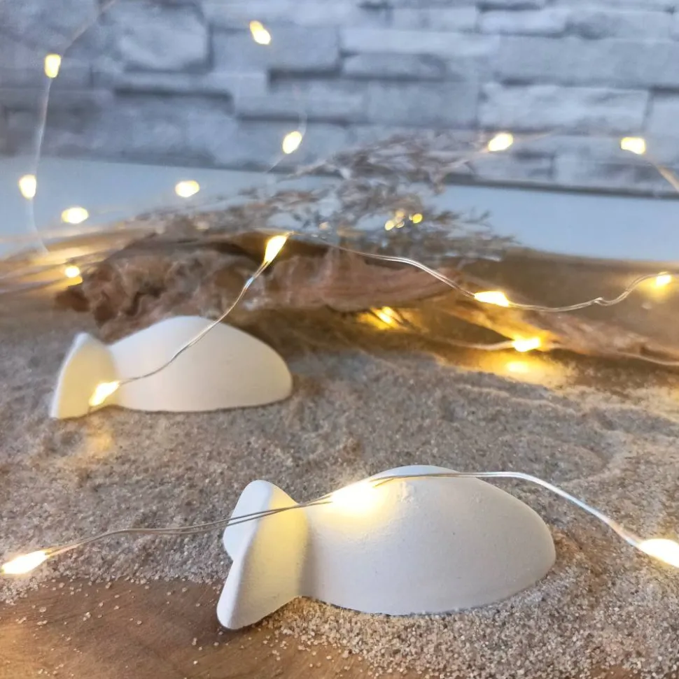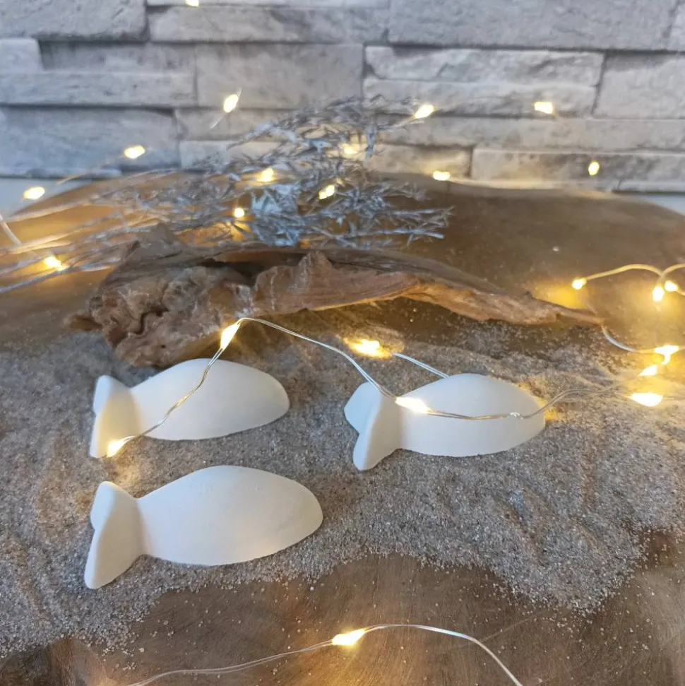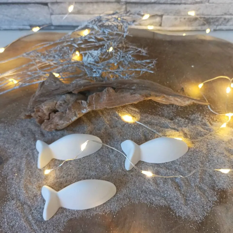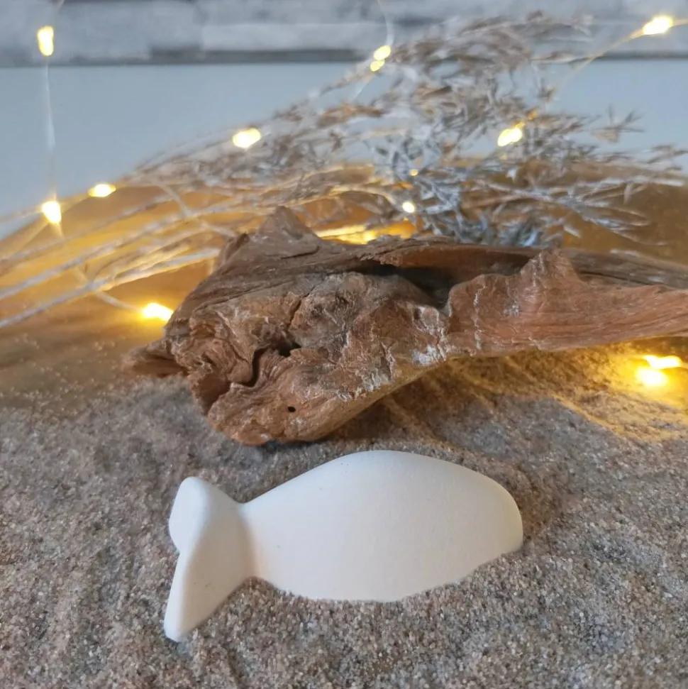 Raysin oder Keraflott, das feine, weiße Gießpulver auf Gipsbasis, wird mit viel Liebe zum Detail in handgefertigte Fische verwandelt. Leichte Unregelmäßigkeiten und Lufteinschlüsse sind charakteristisch für Raysin-Dekorationen und verleihen jedem Fisch seine Einzigartigkeit. Da jedes Produkt ein handgefertigtes Unikat ist, kann es leicht von den Produktfotos abweichen, was es zu einem besonderen Erlebnis macht.