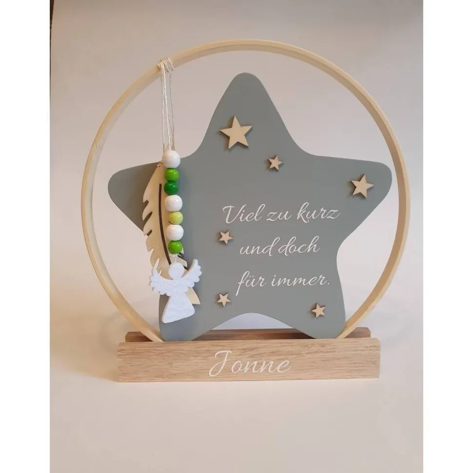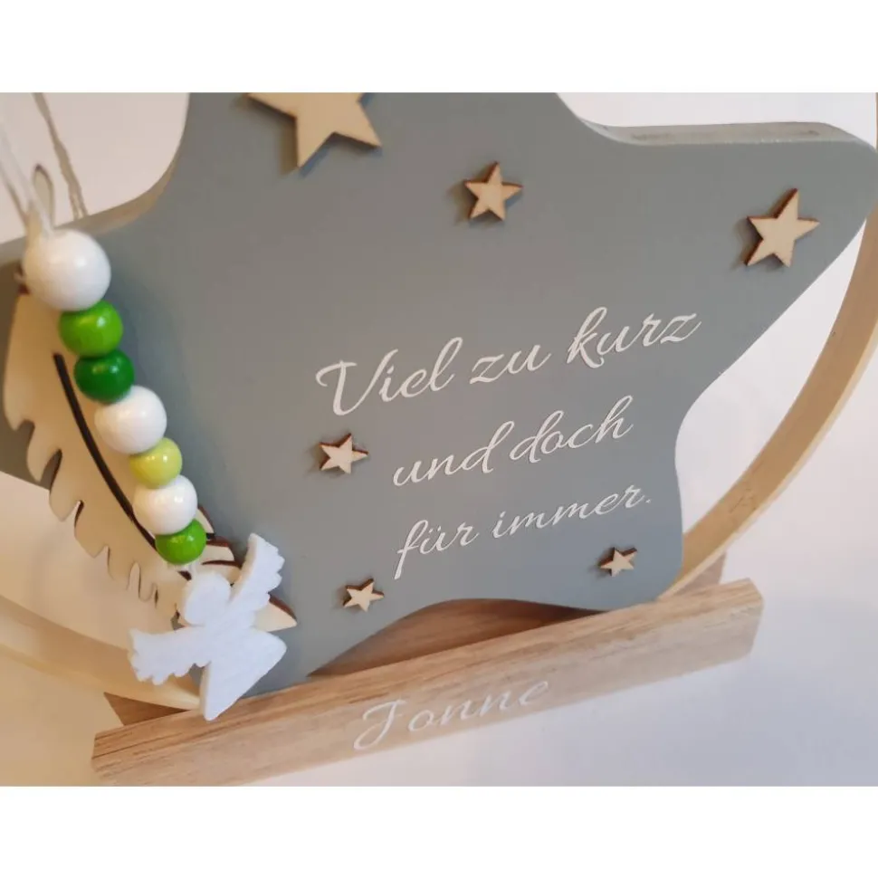Er eignet sich wunderschön zum Aufstellen an einem besonderen Ort – vielleicht auf einem Regal, wo das Licht darauf fällt, oder an einem Ort, an dem er täglich ein kleines Lächeln schenkt. Der Holzstern kann für jeden, der ihn sieht, eine stille, aber berührende Erinnerung sein – etwas, das für immer Bestand hat und uns daran erinnert, dass diese kleine Seele zwar kurz bei uns war, aber große Spuren hinterlassen hat.