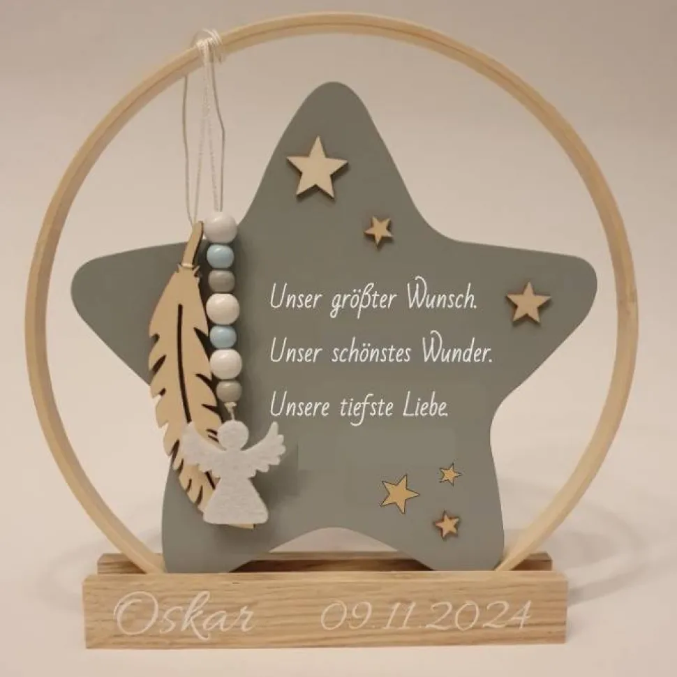 Er eignet sich wunderschön zum Aufstellen an einem besonderen Ort – vielleicht auf einem Regal, wo das Licht darauf fällt, oder an einem Ort, an dem er täglich ein kleines Lächeln schenkt. Der Holzstern kann für jeden, der ihn sieht, eine stille, aber berührende Erinnerung sein – etwas, das für immer Bestand hat und uns daran erinnert, dass diese kleine Seele zwar kurz bei uns war, aber große Spuren hinterlassen hat.