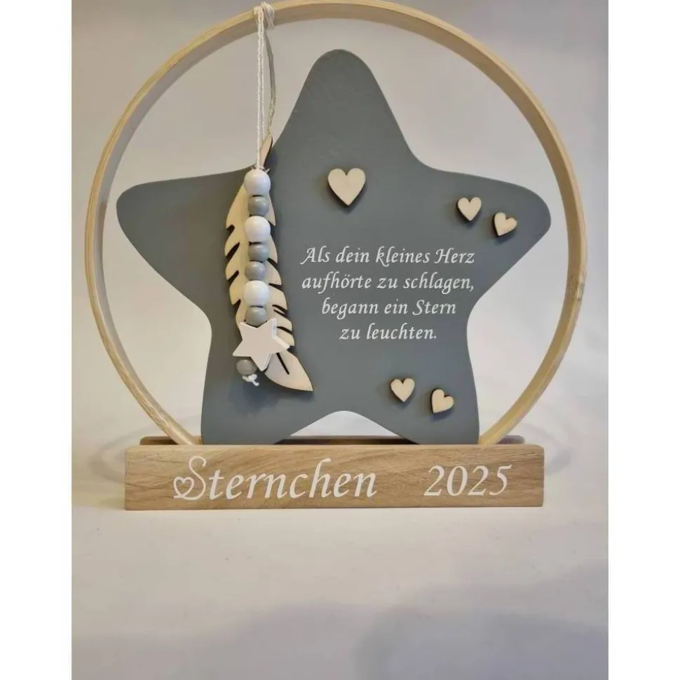 Er eignet sich wunderschön zum Aufstellen an einem besonderen Ort – vielleicht auf einem Regal, wo das Licht darauf fällt, oder an einem Ort, an dem er täglich ein kleines Lächeln schenkt. Der Holzstern kann für jeden, der ihn sieht, eine stille, aber berührende Erinnerung sein – etwas, das für immer Bestand hat und uns daran erinnert, dass diese kleine Seele zwar kurz bei uns war, aber große Spuren hinterlassen hat.
