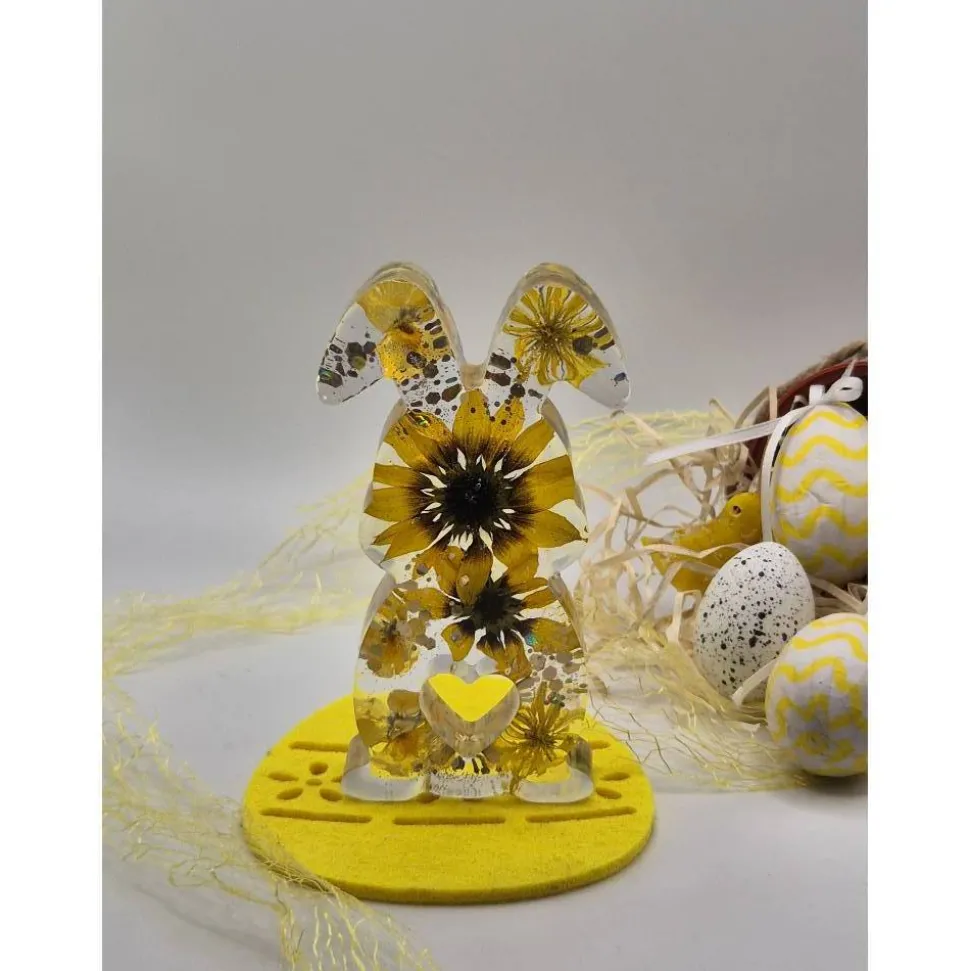 Dieser liebevoll gefertigte Hase ist ein ganz besonderer Blickfang für deine Frühlings- und Osterdekoration. In aufwendiger Handarbeit aus klarem Epoxidharz gegossen mit echten, sorgfältig getrockneten Blumen in gelb veredelt und funkelnden Glitzer Akzenten ist jedes Stück ein echtes Unikat – kein Hase gleicht dem anderen.