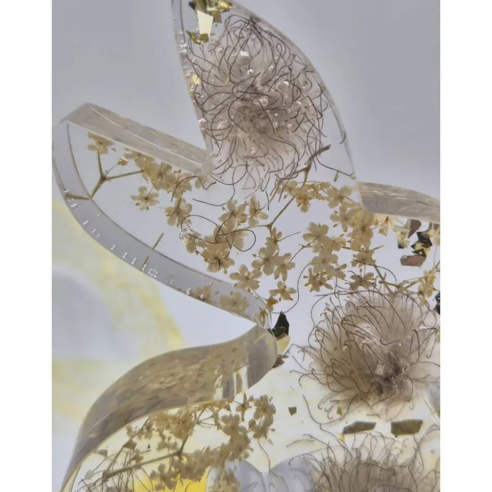 Dieser liebevoll gefertigte Hase ist ein ganz besonderer Blickfang für deine Frühlings- und Osterdekoration. In aufwendiger Handarbeit aus klarem Epoxidharz gegossen mit echten, sorgfältig getrockneten Blumen in weiß-Beige veredelt und funkelnden Glitzer Akzenten ist jedes Stück ein echtes Unikat – kein Hase gleicht dem anderen.