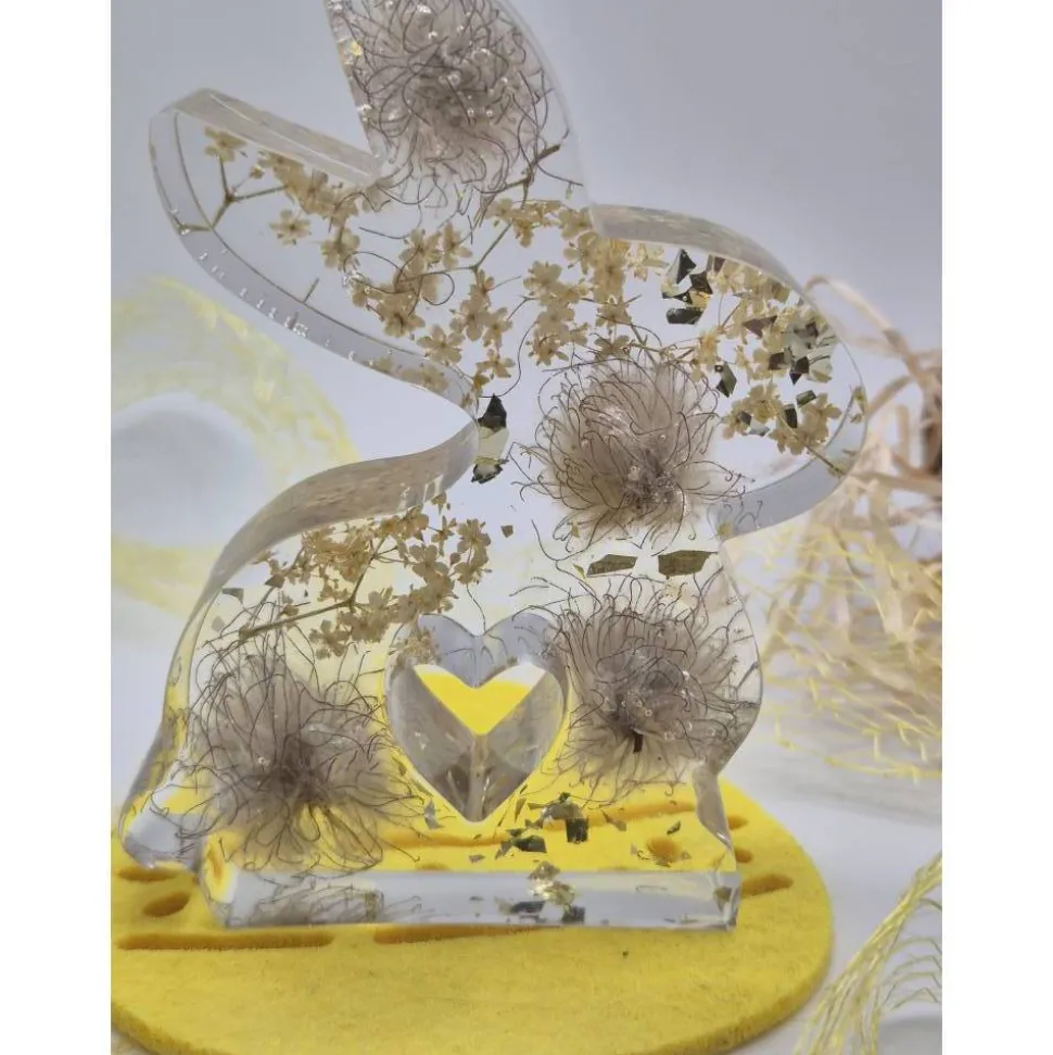 Die eingebetteten Blüten wirken, als würden sie im Hasen schweben, und verleihen ihm eine zarte, natürliche Leichtigkeit. Durch das transparente Harz kommen die Farben der Blüten wunderschön zur Geltung und machen den Hasen zu einem kleinen Kunstwerk.