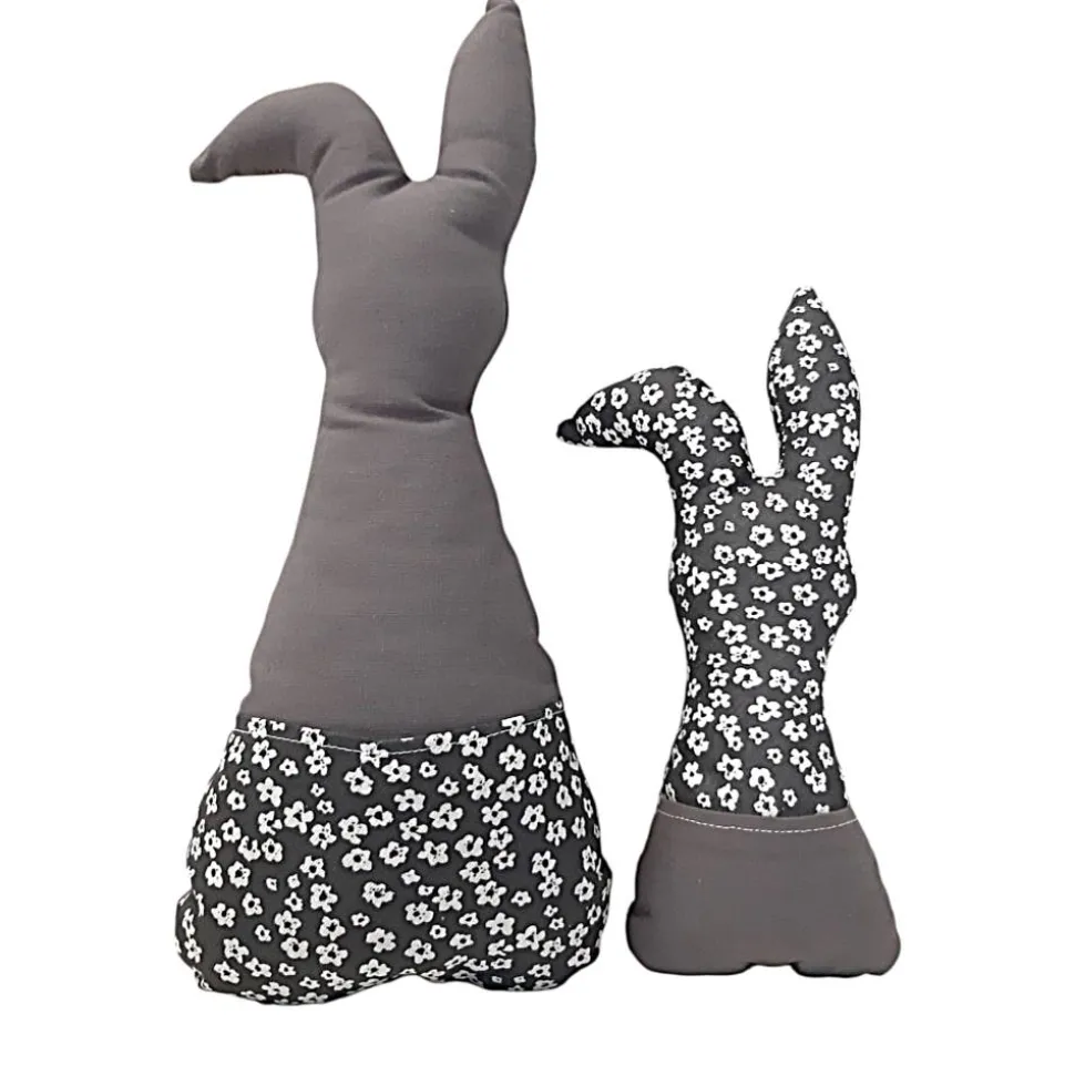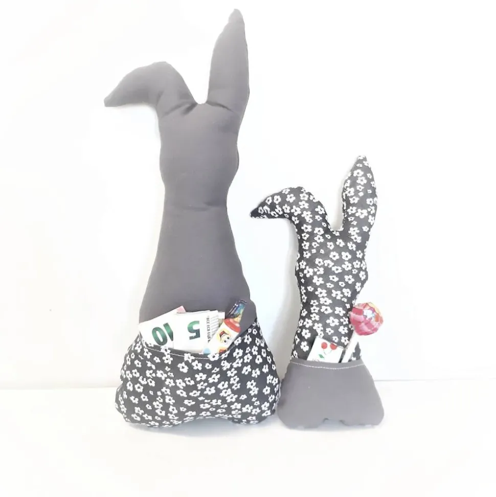 Dieses süße Osterhasen Paar (großer und kleiner Hase), dürfen an Ostern nicht fehlen. Eine schöne Deko und ein niedliches Geschenk für Kinder, denn die Hosentaschen der Häschen lassen sich mit süßem und/oder ein paar Geldscheinen befüllen. Sie sind aus hochwertigen Baumwollstoff genäht und mit Füllwatte ausgestopft.