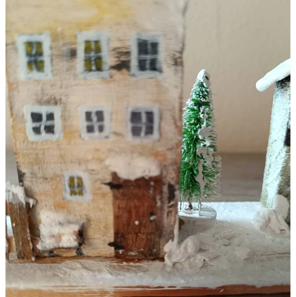 Material: Vollholz, Acrylfarben, Kalkfarbe, Kunstschnee, Brennholz,