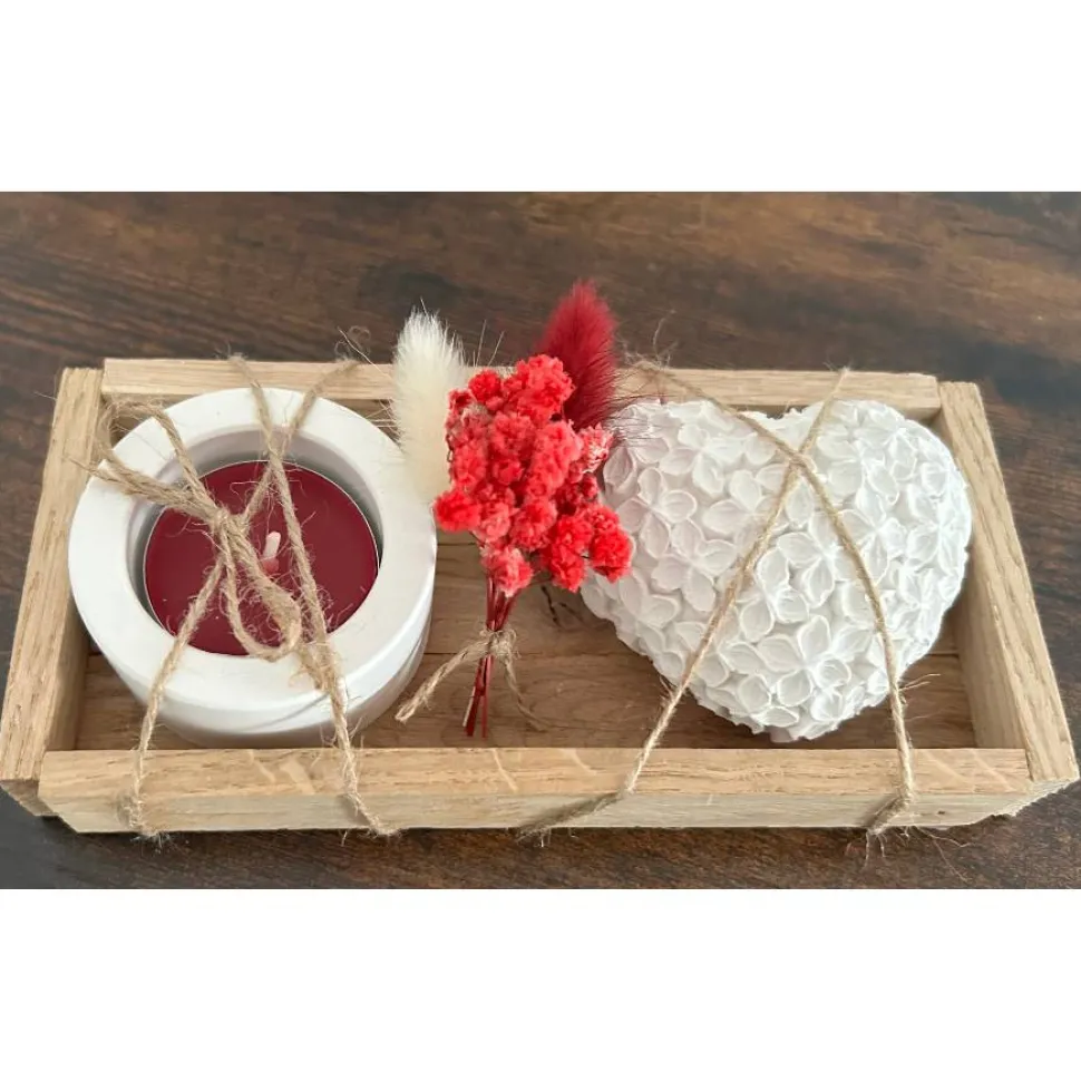 Das strukturierte Herz und der Teelichthalter aus Gießkeramik sorgen zusammen mit den Trockenblumen für ein stimmungsvolles und wohnliches Ambiente. Jedes Set wird von Hand gefertigt und dekoriert, daher ist jedes Stück ein echtes Unikat – kleine Abweichungen in Holzmaserung, Trockenblumenfarbe oder Struktur unterstreichen die Einzigartigkeit.