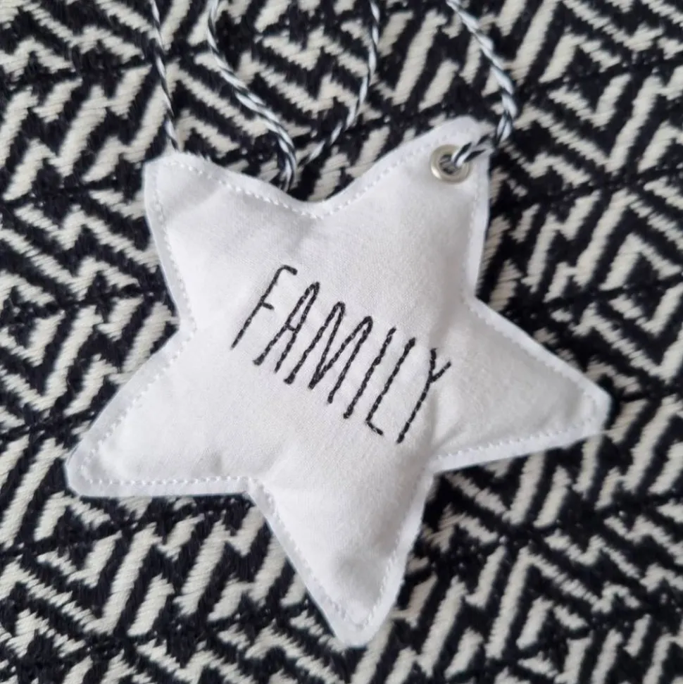 Der Stern wurden aus einem Vintage-Baumwollstoff aus den 60er Jahren hergestellt, der in seinem Vorleben Teil einer Aussteuer-Bettwäsche war. Er wurde selbstverständlich gewaschen und auf Löcher und Verschmutzung hin kontrolliert. Der Stoff ist in der sog. Linon-Webart gemacht worden und weist dadurch eine leicht grobe Struktur auf, die an Leinen erinnert und die gut zu den klaren schwarzen Buchstaben passt.