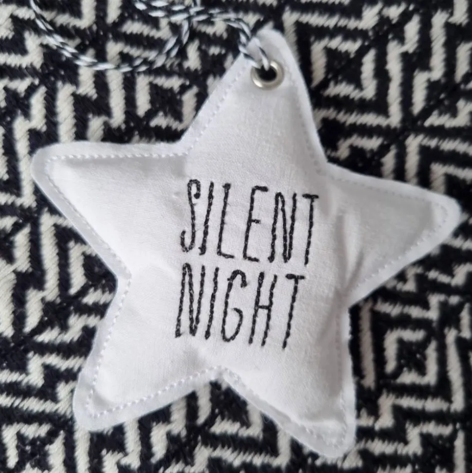 Der Stern wurden aus einem Vintage-Baumwollstoff aus den 60er Jahren hergestellt, der in seinem Vorleben Teil einer Aussteuer-Bettwäsche war. Er wurde selbstverständlich gewaschen und auf Löcher und Verschmutzung hin kontrolliert. Der Stoff ist in der sog. Linon-Webart gemacht worden und weist dadurch eine leicht grobe Struktur auf, die an Leinen erinnert und die gut zu den klaren schwarzen Buchstaben passt.