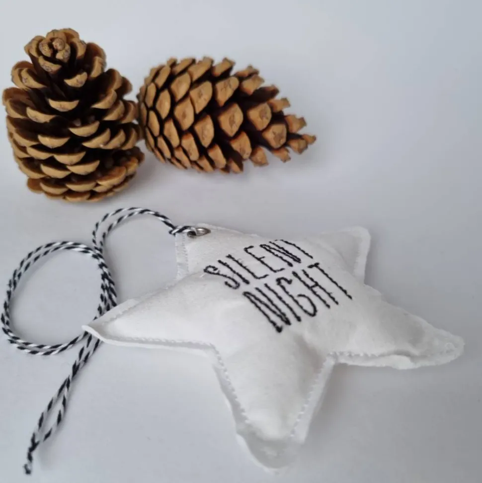 Der Deko-Stern ist mit einer Stickmaschine erstellt (ITH), mit Füllwatte ausgestopft und im Anschluss einfach ausgeschnitten worden. Deshalb kann er im Laufe der Zeit etwas ausfransen, was den Vintage-Charakter noch weiter unterstreicht und keinen Mangel darstellt. Ein gewollter Patina-Look entsteht.