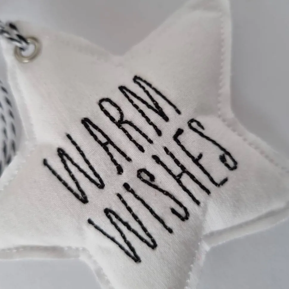 Der Stern wurden aus einem Vintage-Baumwollstoff aus den 60er Jahren hergestellt, der in seinem Vorleben Teil einer Aussteuer-Bettwäsche war. Er wurde selbstverständlich gewaschen und auf Löcher und Verschmutzung hin kontrolliert. Der Stoff ist in der sog. Linon-Webart gemacht worden und weist dadurch eine leicht grobe Struktur auf, die an Leinen erinnert und die gut zu den klaren schwarzen Buchstaben passt.