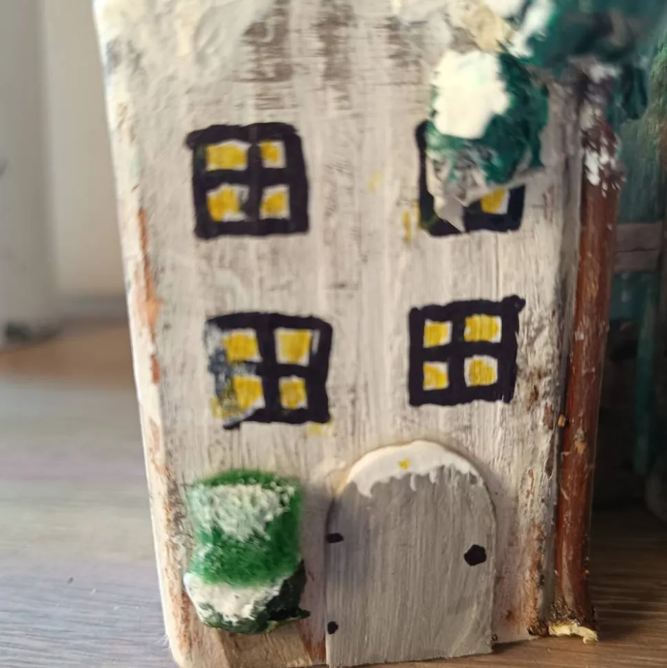 bemalt und mit Schnee aus weißer Kalkfarbe versehen!