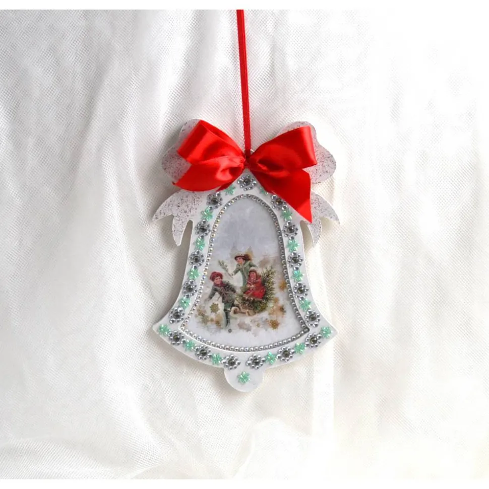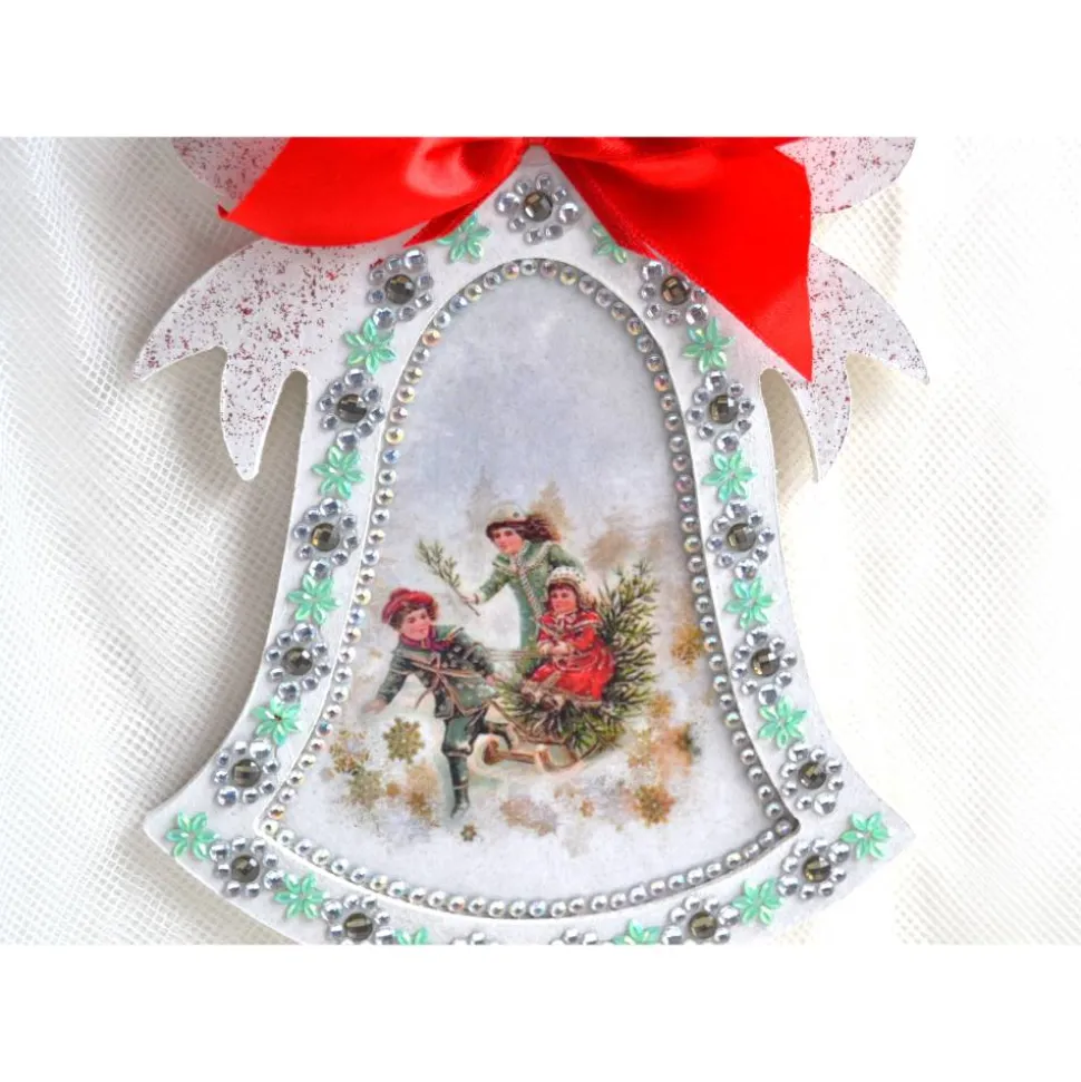 Wandbild aus MDF. Das nostalgische Bild ist aus Reispapier. Verziert ist die Glocke mit einer Strassbordüre sowie einer roten Satinschleife.