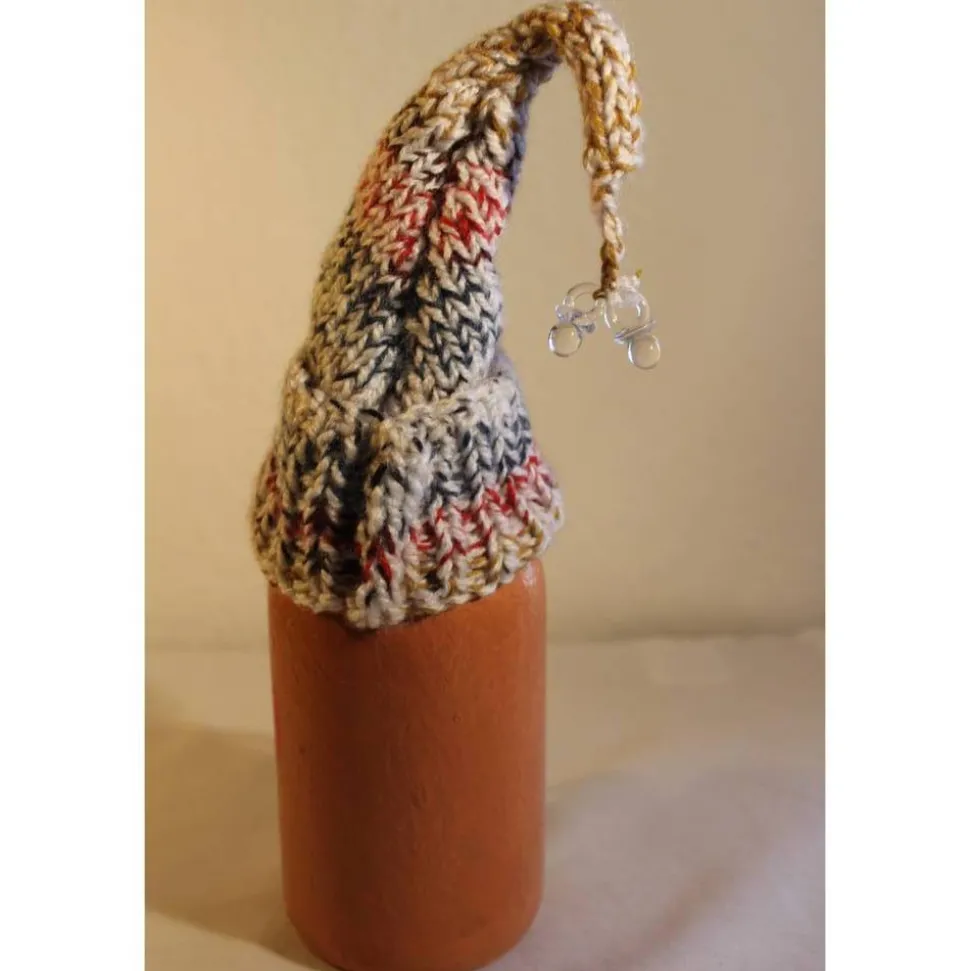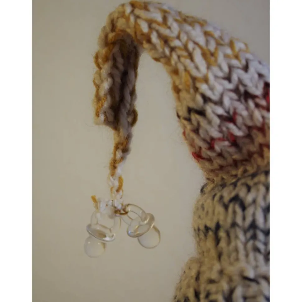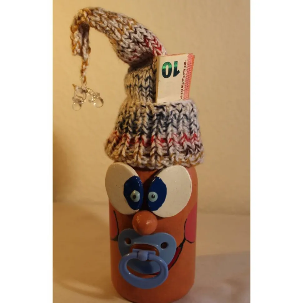 Witzige Figur aus einer Glasflasche. Upcycling-Projekt, gestaltet mit Acrylfarbe und einem handgestrickten Wollmützchen. Am Wollmützchen sind zwei Mini-Schnuller aus transparentem Kunststoff befestigt. Kann als Geldgeschenk verwendet werden, indem man einen Geldschein in die Mütze steckt :), siehe Beispielfoto.