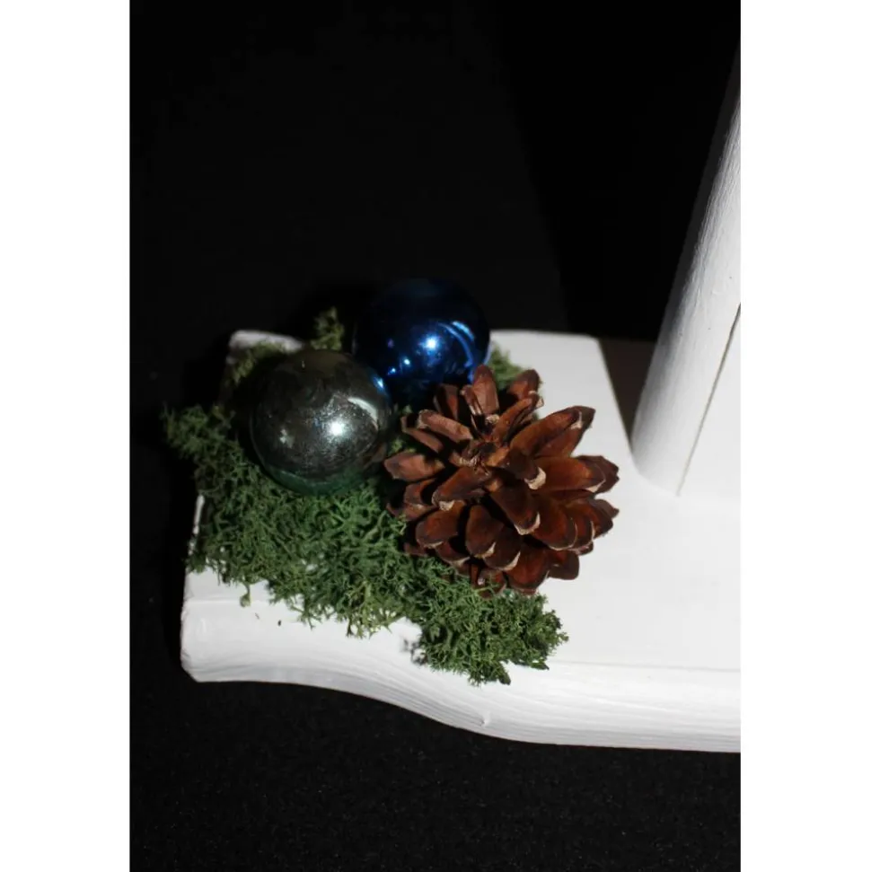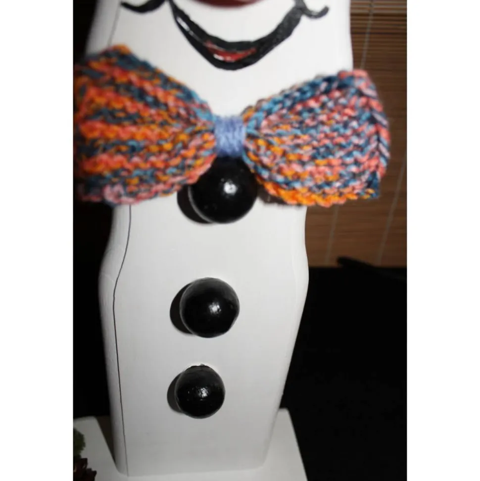 Witzige Schneemann-Figur aus grobem Holz mit Acrylfarben bemalt. Lustige Gestaltung mit handgestrickter Wollmütze und Fliege, dekoriert mit Zapfen, Moos und kleinen Weihnachtskugeln.