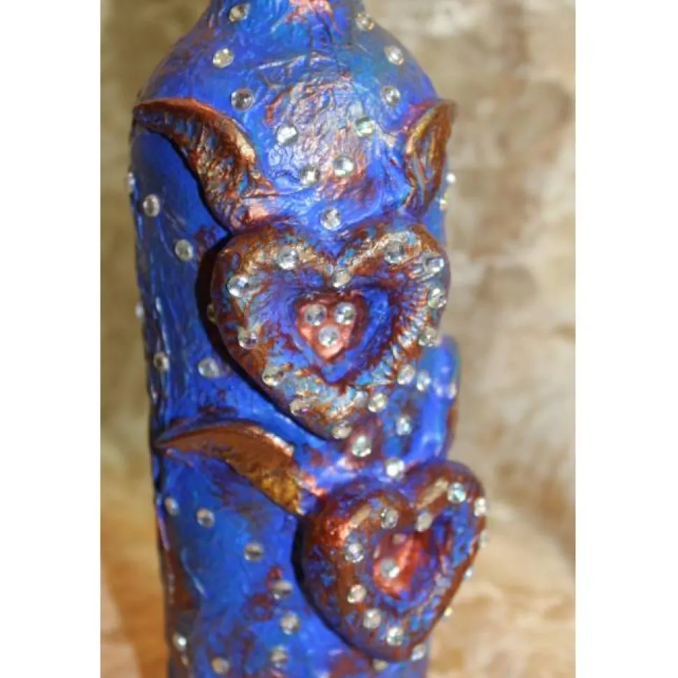 Acrylmalerei/Collage auf einer Glasflasche. Witziges Upcycling-Projekt, künstlerisch gestaltet mit Modelliermasse, Styropor, und Papier. Bemalt mit Acrylfarben in Blau und schillerndem Kupfer.