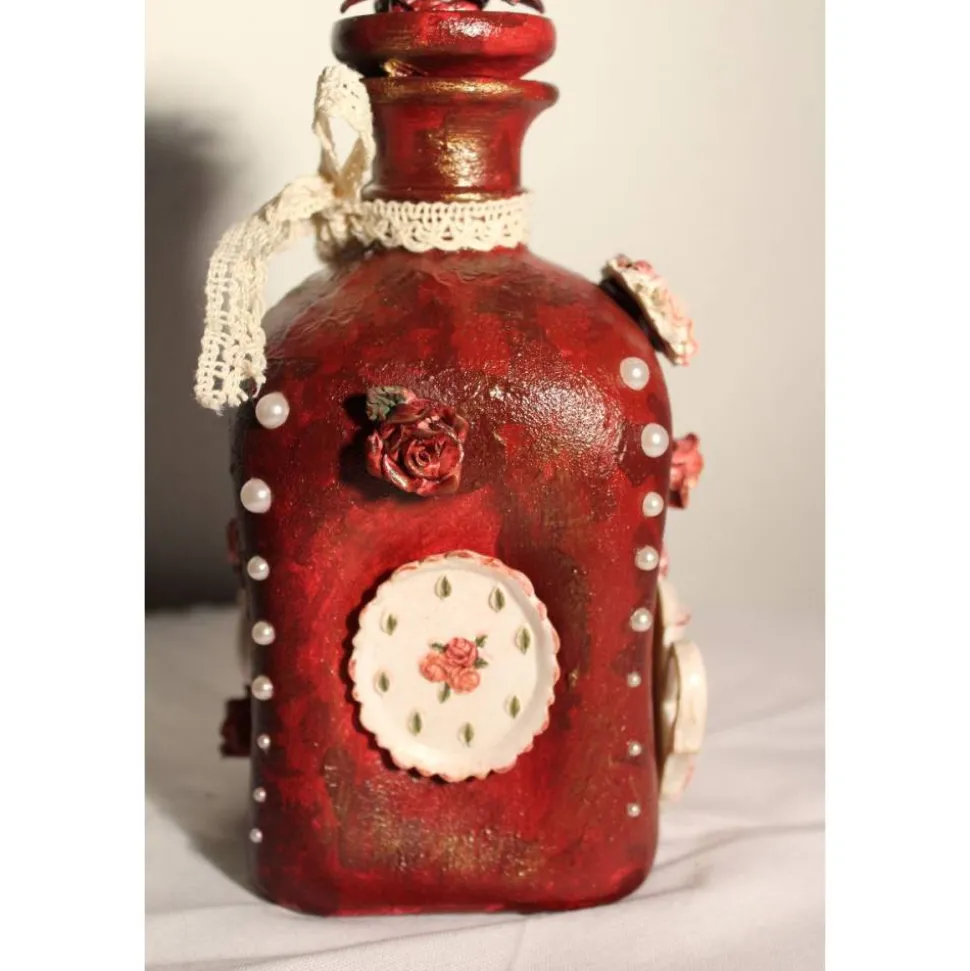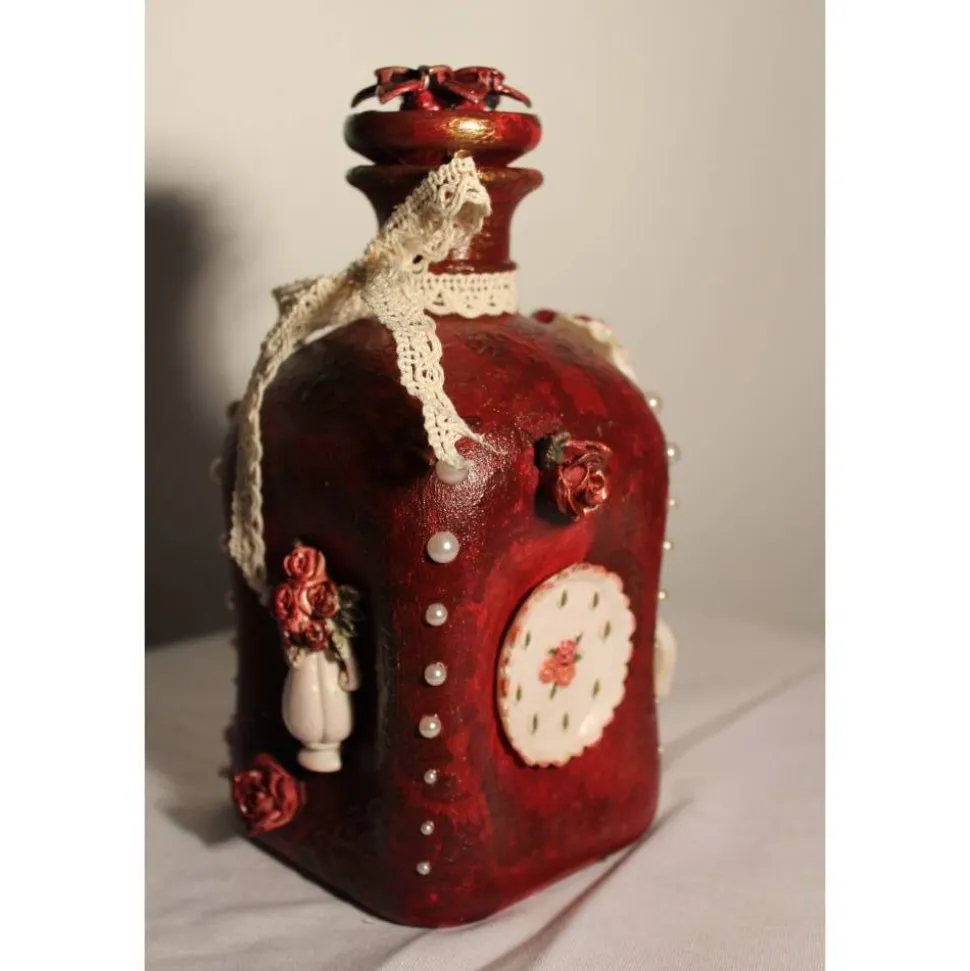 Witzige Gestaltung aus einer Glasflasche mit Acrylfarben in Weinrot bemalt. Upcyclingobjekt dekoriert mit Halbperlen, Stoffband und und Elementen aus Kunststoff.