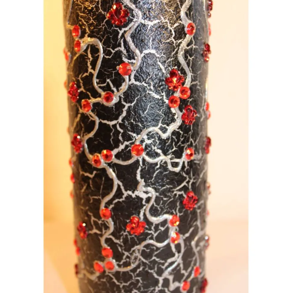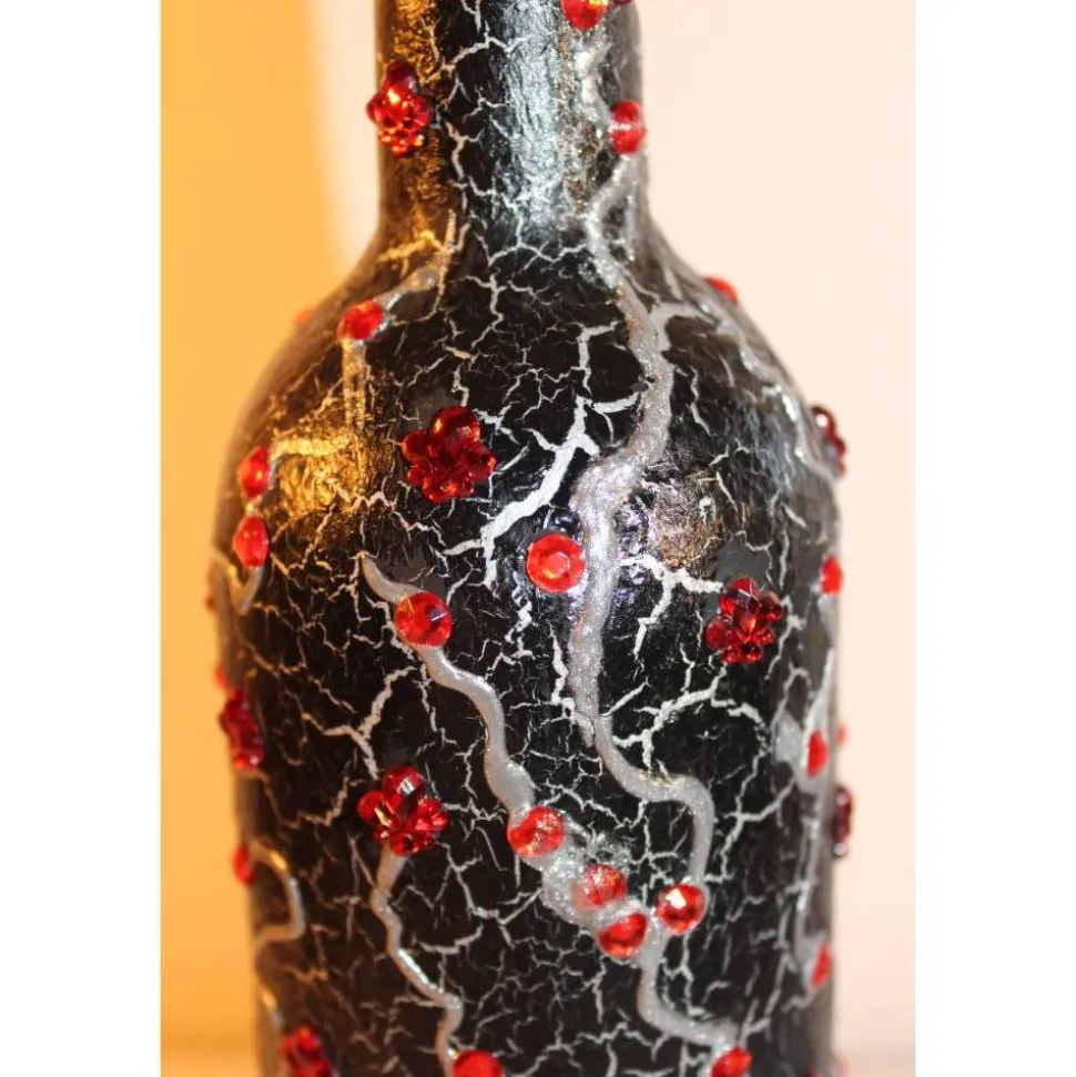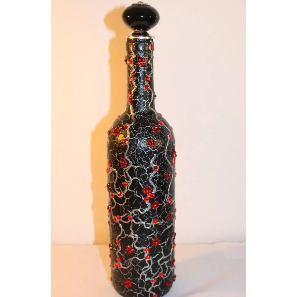 Acrylmalerei/Collage auf einer Glasflasche, in Schwarz, Silber und Rot gehalten. Witziges Upcycling-Projekt, künstlerisch gestaltet mit Acrylfarben und Glitzersteinen. Wunderschöne Vintage-Effekte durch Rissbildung in der Farbe.