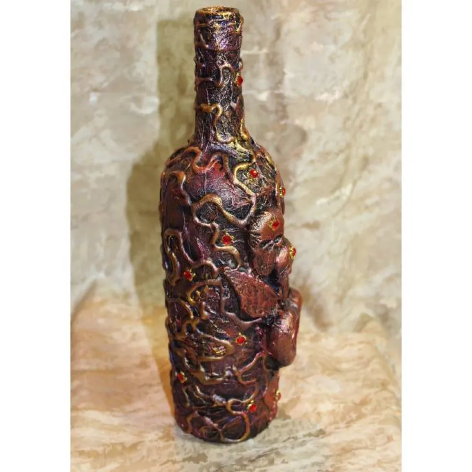 Acrylmalerei/Collage auf einer Glasflasche. Witziges Upcycling-Projekt, künstlerisch gestaltet mit Totenköpfen und Flügeln aus Modelliermasse, einem Herz aus Styropor und Papier. Bemalt mit Acrylfarben in Blau, Schwarz, Rot und schillerndem Kupfer.