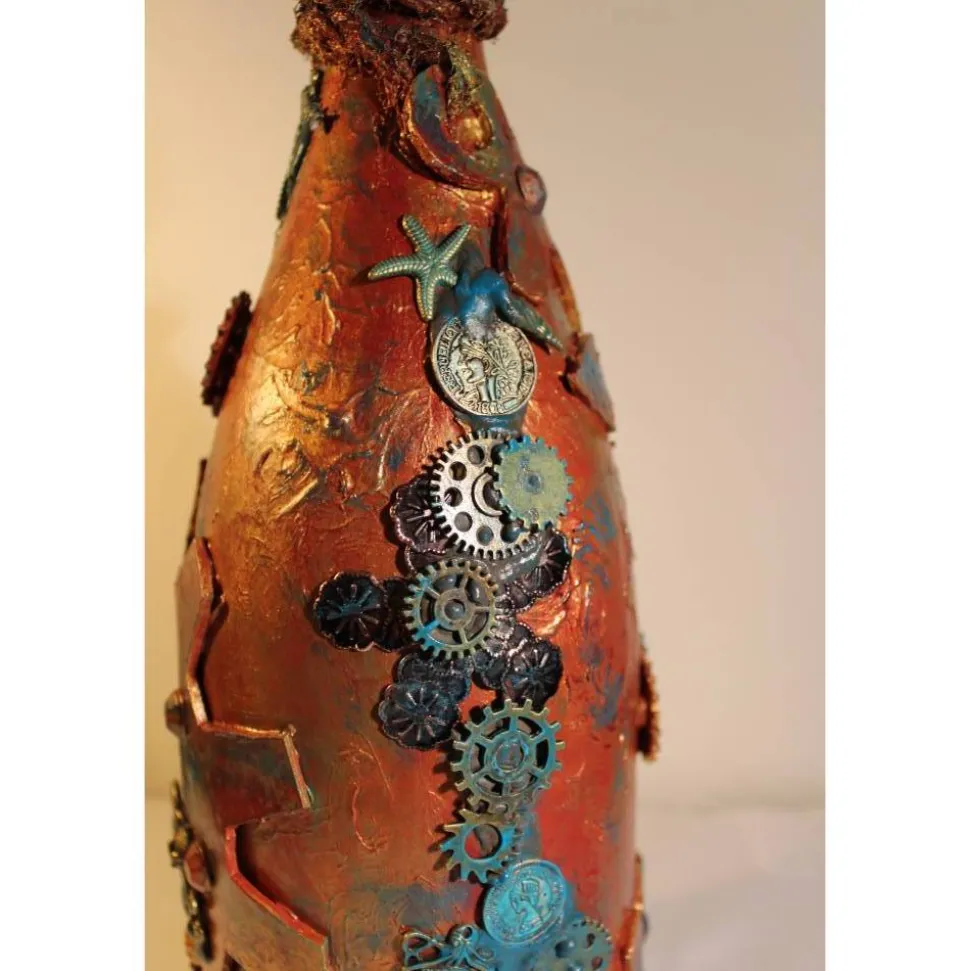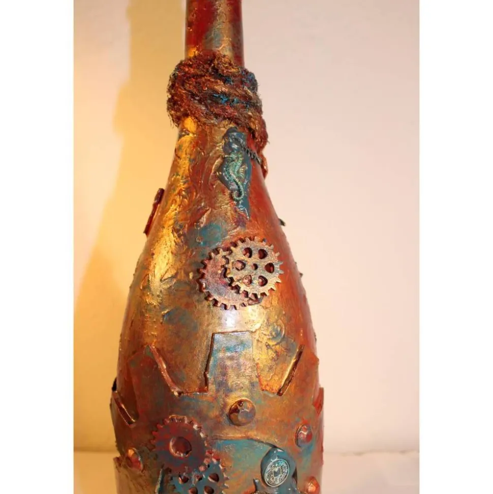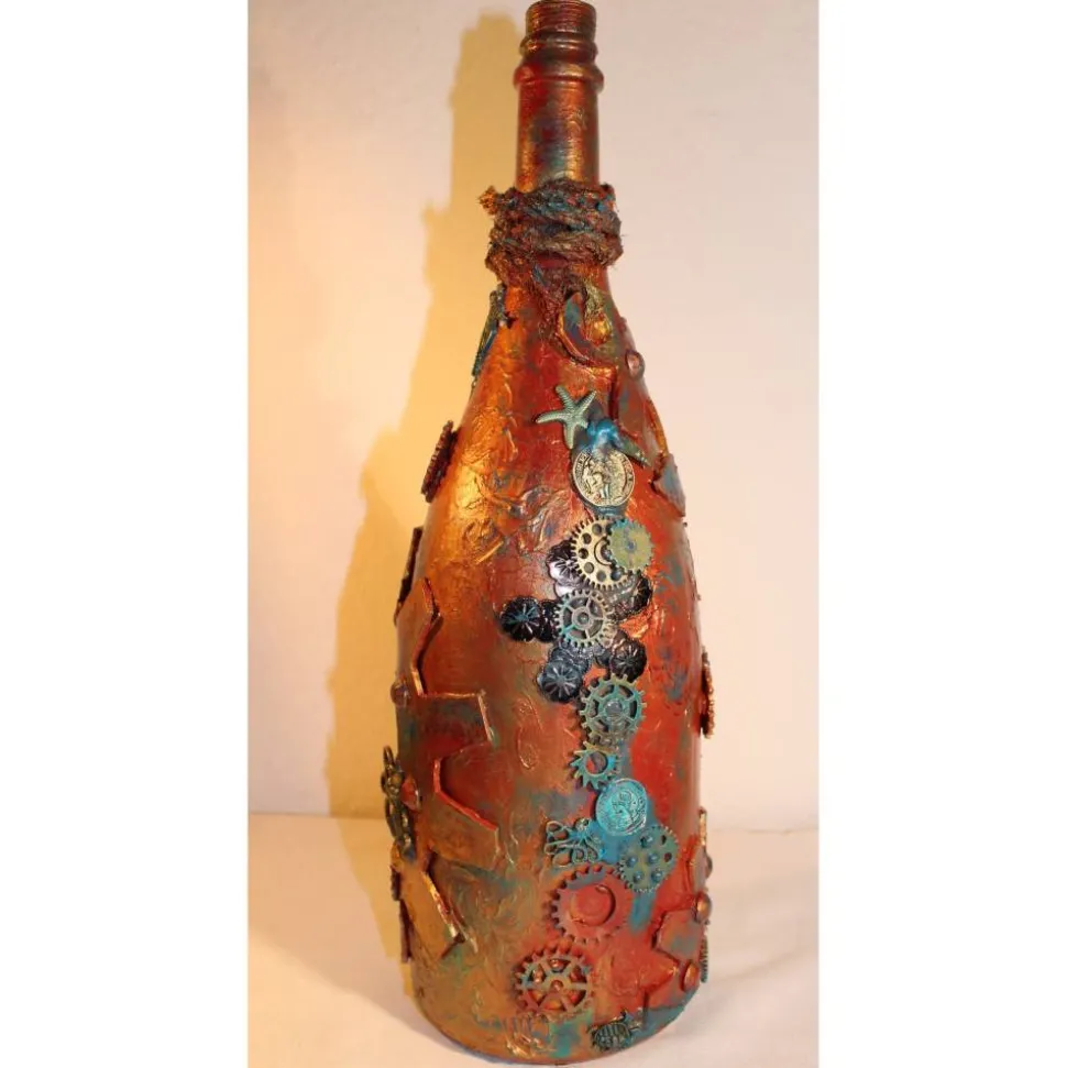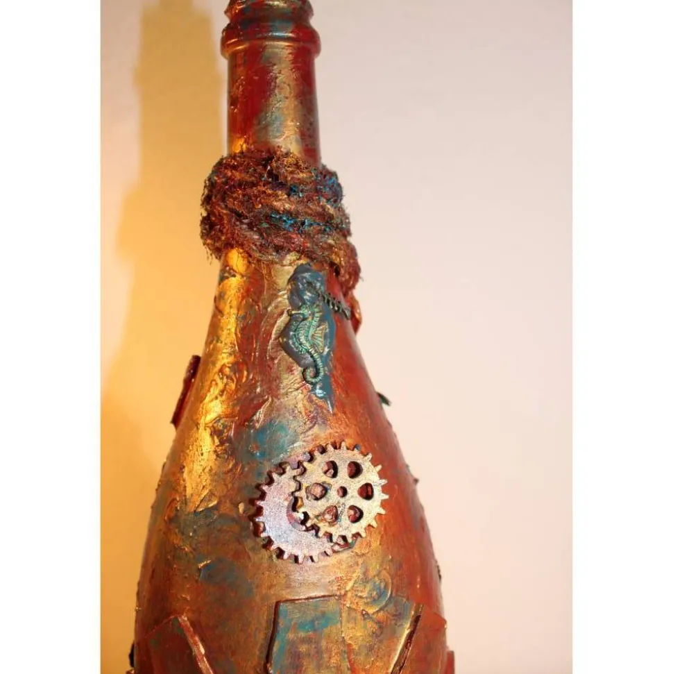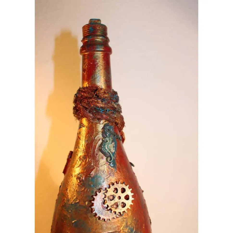 Acrylmalerei/Collage auf einer großen Glasflasche im Industrial Style. Witziges Upcycling-Projekt, künstlerisch gestaltet mit Zahnrädern, maritimen Applikationen aus Holz, Kunststoff und Metall. Wunderschöne dunkle Farben mit Gold- und Kupfereffekten verziert.
