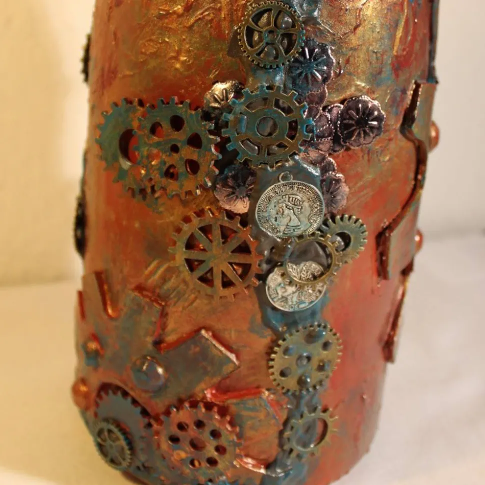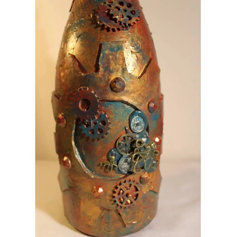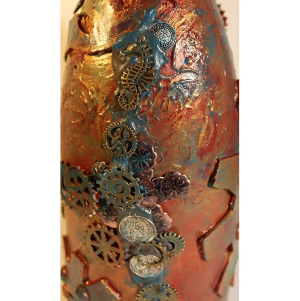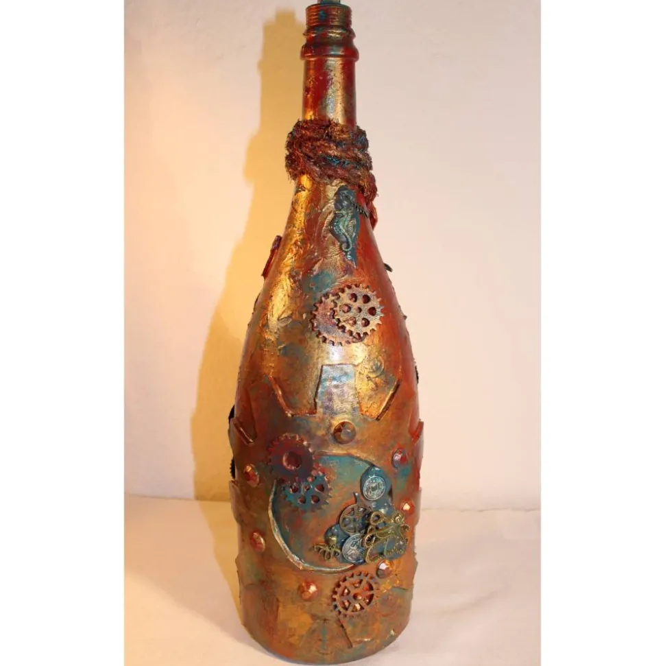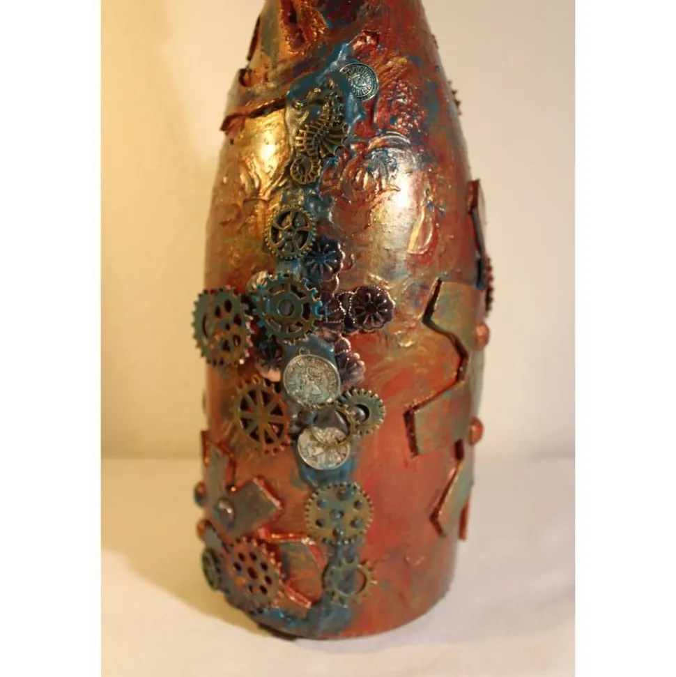 Acrylmalerei/Collage auf einer großen Glasflasche im Industrial Style. Witziges Upcycling-Projekt, künstlerisch gestaltet mit Zahnrädern, maritimen Applikationen aus Holz, Kunststoff und Metall. Wunderschöne dunkle Farben mit Gold- und Kupfereffekten verziert.