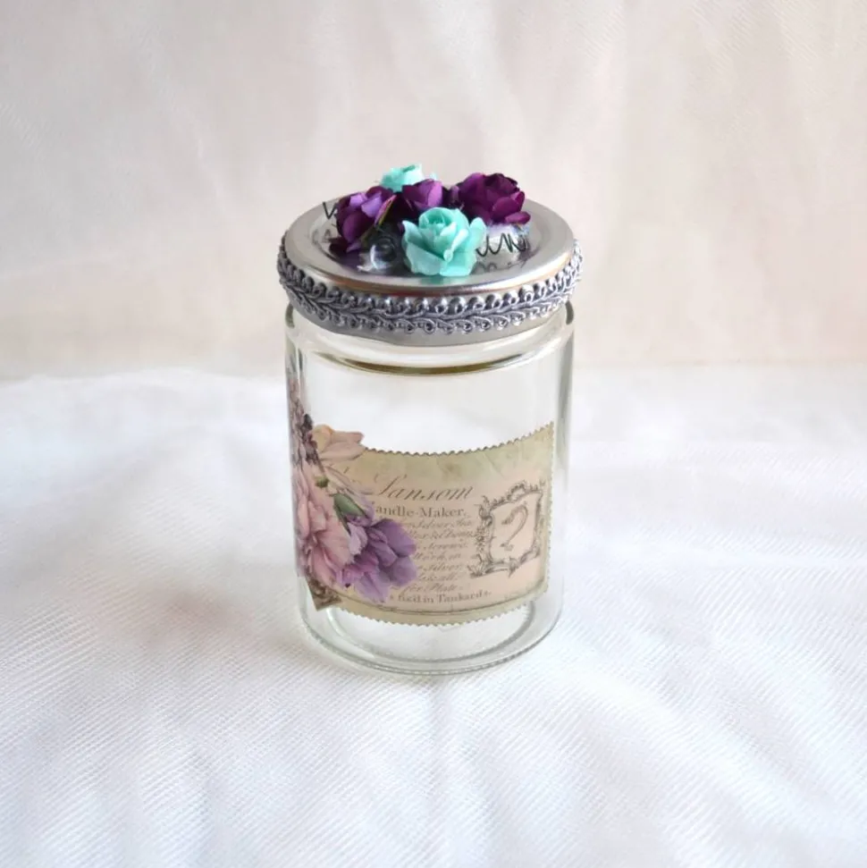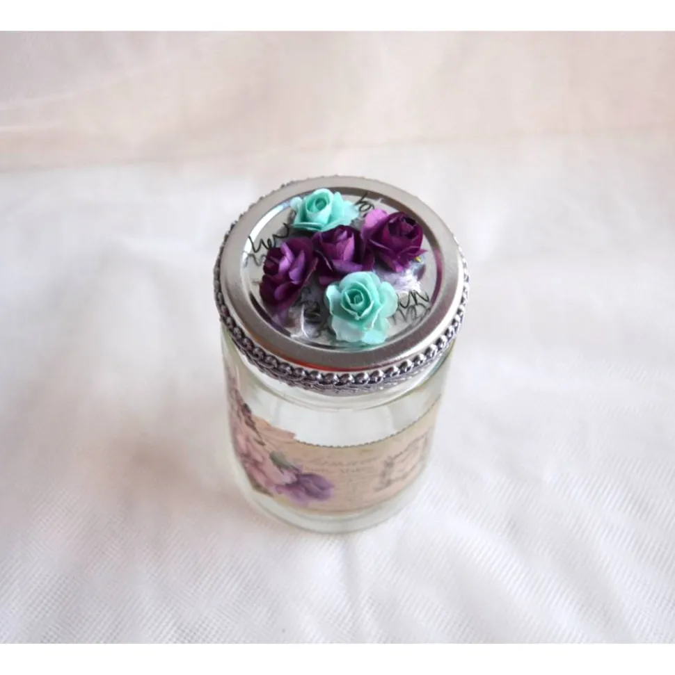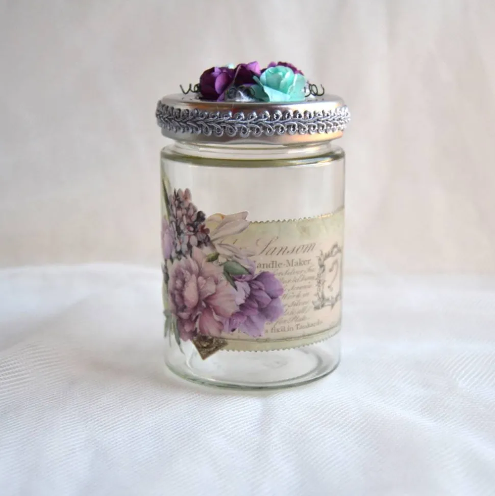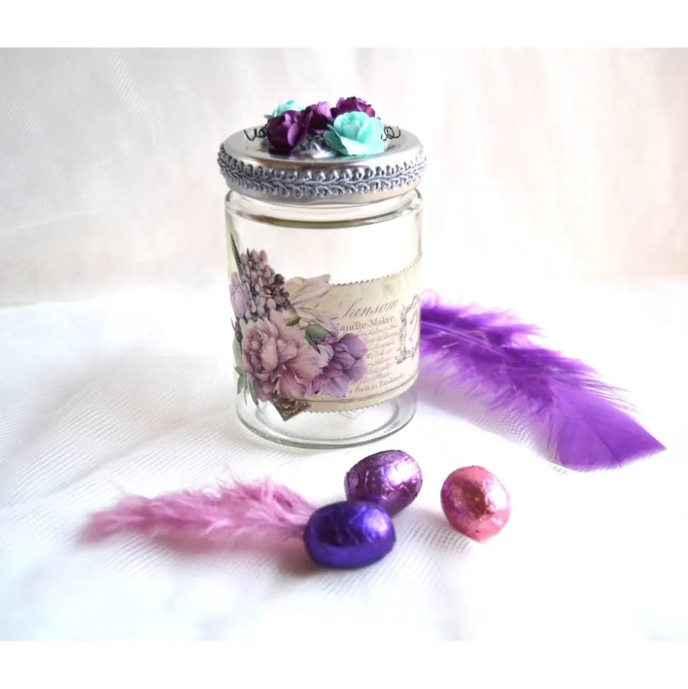 Dieses schöne Glas ist mit Porzellansticker, Stoffband und kleinen Papierrosen verziert. Der Sticker kann zum Spülen des Glases abgenommen werden. Nachdem das Glas abgetrocknet ist, kann der Sticker wieder auf dem Glas angebracht werden. Einfach auflegen und etwas andrücken, ohne Kleber oder sonstiges. Sie können den Sticker auch auf andere glatten Flächen wie Tassen, Vasen, andere Gläser oder Fließen auflegen. Mit kleinen Süßigkeiten, Geld oder Gutschein gefüllt ist es eine schöne Verpackung, das sich anschließend wunderbar als Deko-Objekt eignet. (Lieferung ohne Federn.)