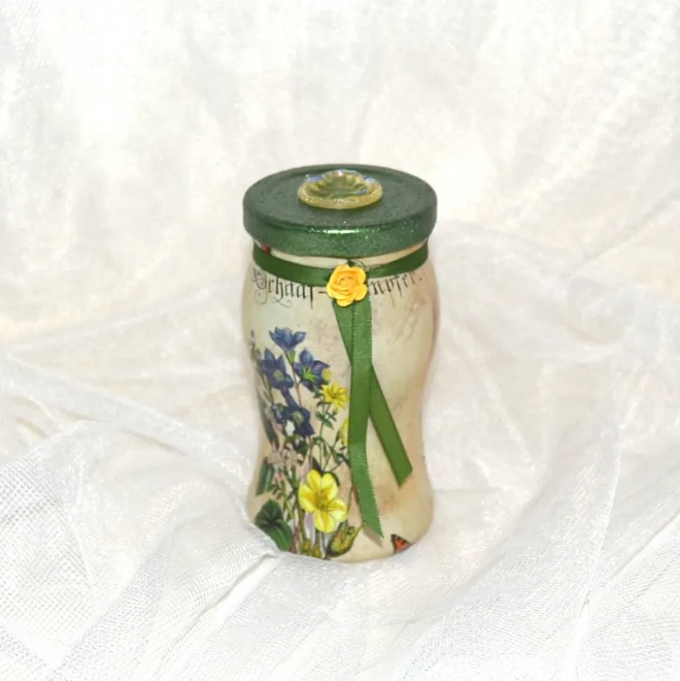 Dieses schöne Glas wurde in Handarbeit mit einer Banderole mit romantischem Blumenmotiv, Papierblume und einer Rose aus Resin auf dem Deckel verziert. Mit kleinen Süßigkeiten, Geld oder Gutschein gefüllt ist es eine schöne Verpackung, das sich anschließend wunderbar als Deko-Objekt eignet. Mit einem LED Teelicht im Glas erhalten Sie eine romantische Stimmung am Abend. Eine Verpackung die nicht gleich den Inhalt erahnen lässt. Dieses romantische Dekoglas kann auch weiter verschenkt werden.