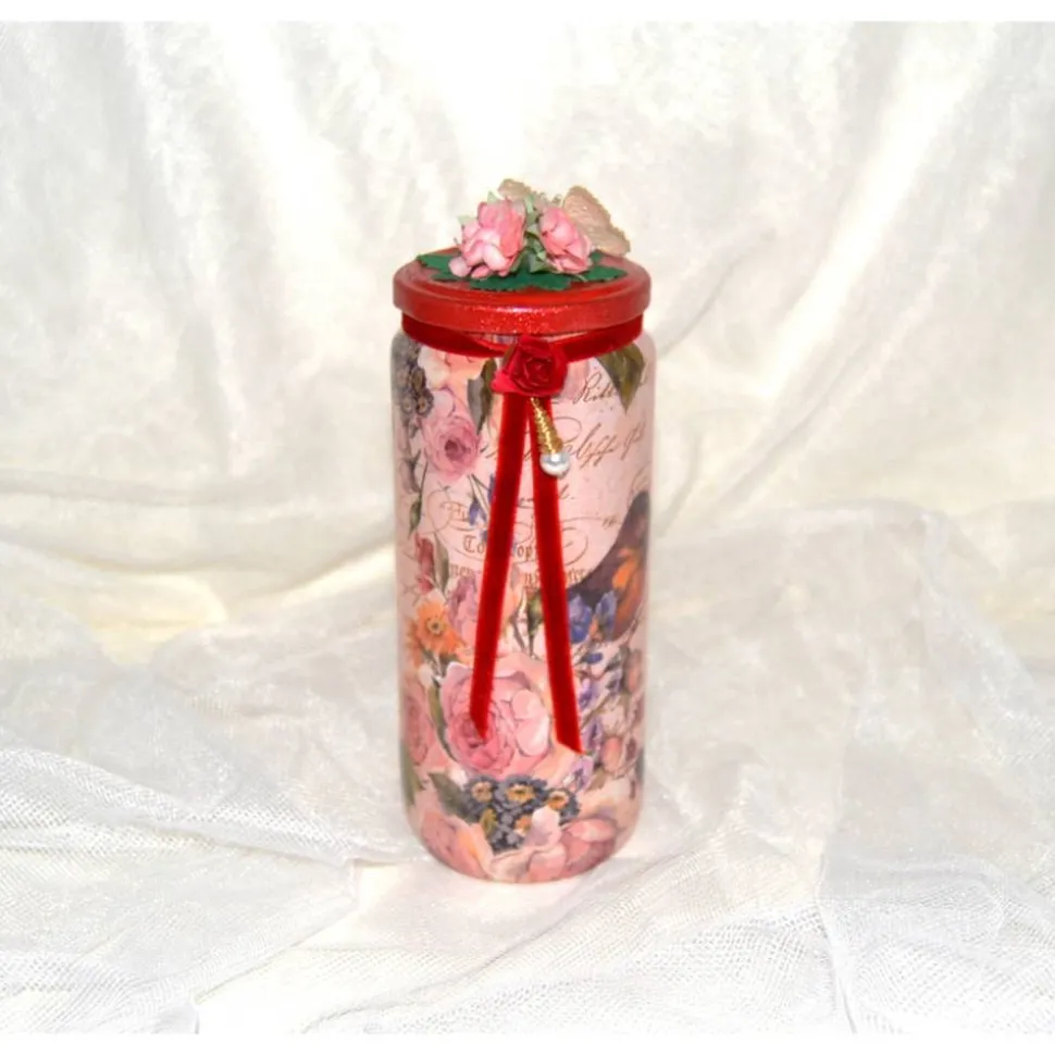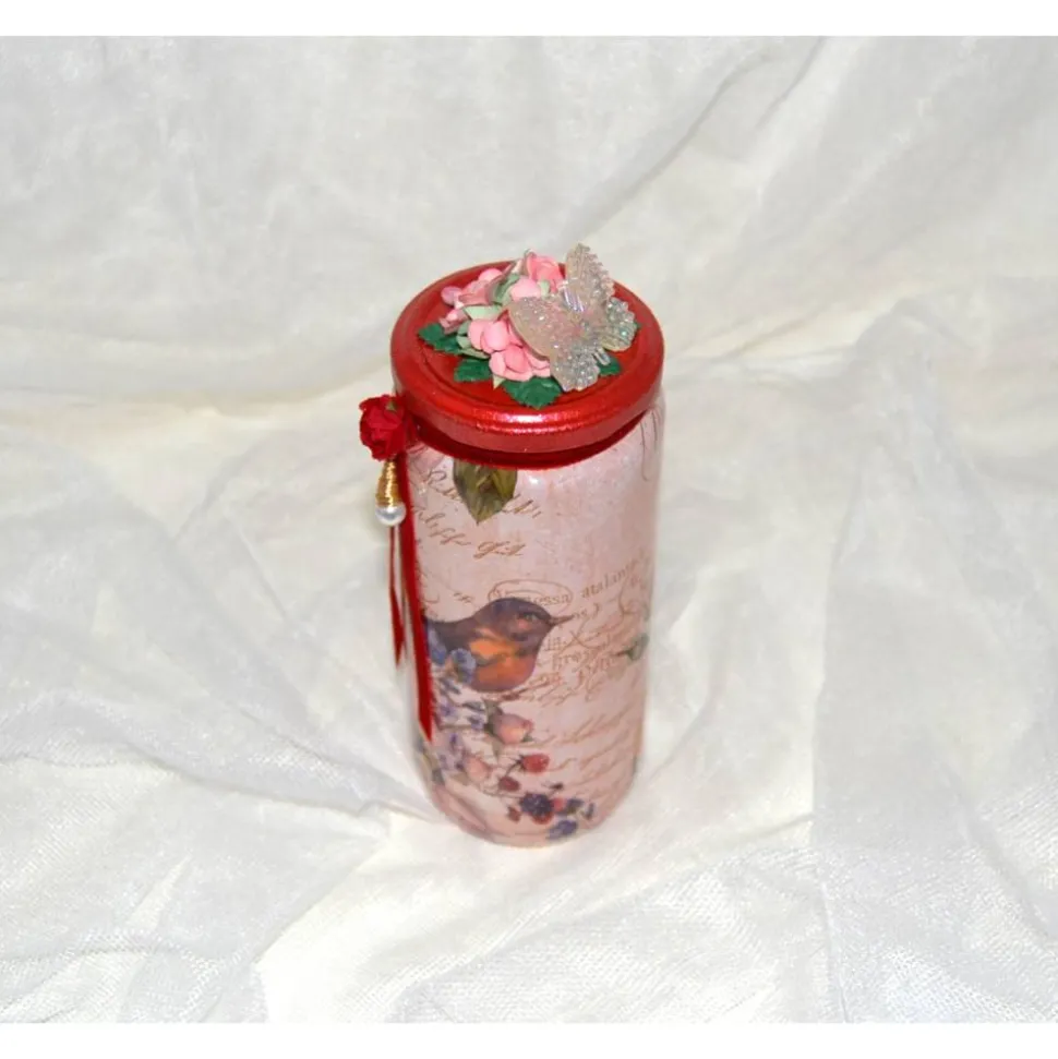 Dieses schöne Glas wurde in Handarbeit mit einer Banderole mit romantischem Vogelmotiv, Papierblumen, roter Samtschleife, Perlenanhänger sowie mit einem Schmetterling aus Resin verziert. Mit kleinen Süßigkeiten, Geld oder Gutschein gefüllt ist es eine schöne Verpackung, das sich anschließend wunderbar als Deko-Objekt eignet. Mit einem LED Teelicht im Glas erhalten Sie eine romantische Stimmung am Abend. Eine Verpackung die nicht gleich den Inhalt erahnen lässt. Dieses romantische Dekoglas kann auch weiter verschenkt werden.