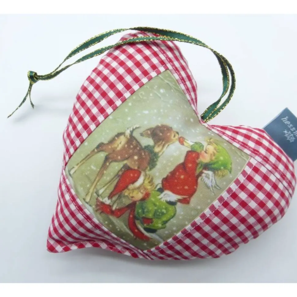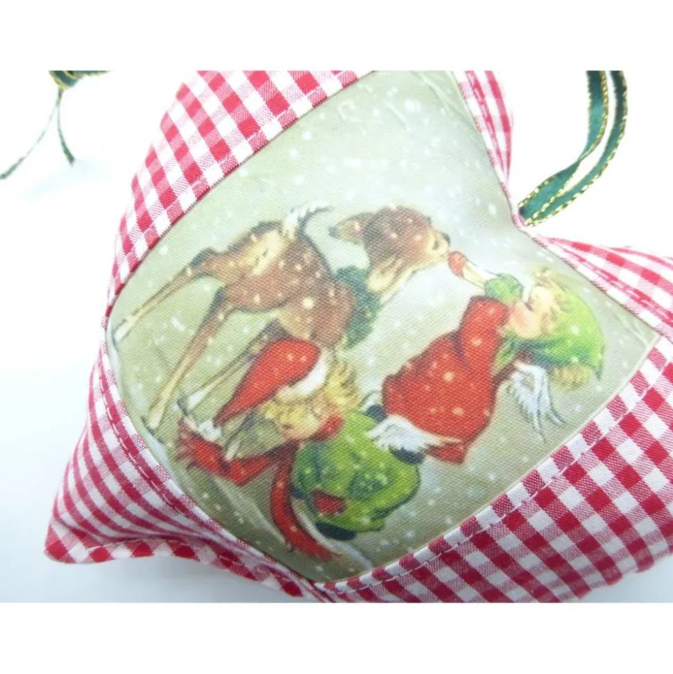 Das Herz ist mit Füllwatte gestopft und hat ein grün-goldenes Satinbändchen.