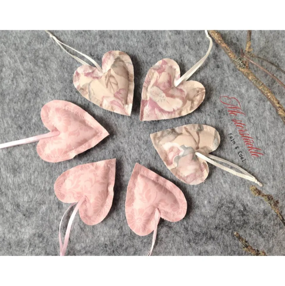 * 6-er Set (3x rosé / 3x beige mit Blumenmotiv) kleine Stoffherzchen zur Deko, Herzanhänger, Dekohänger